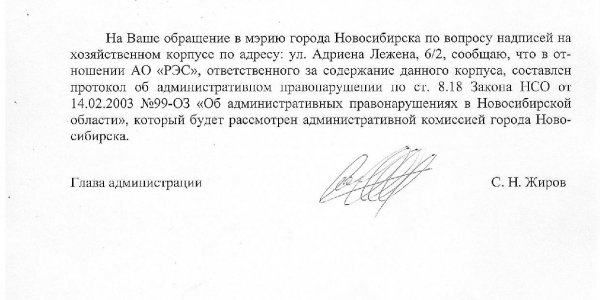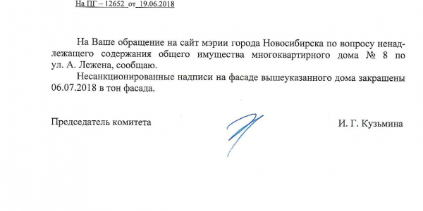 Номер жалобы:35947 Тип жалобы:Иные проблемы ЖКХ Название объекта:Управляющая Компания Регион:Новосибирская область Город:Новосибирск Адрес:ул. Адриена Лежена, 8 Описание жалобы:Надписи на фасаде дома Статус:
