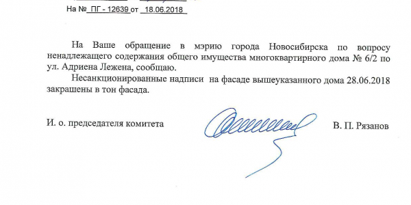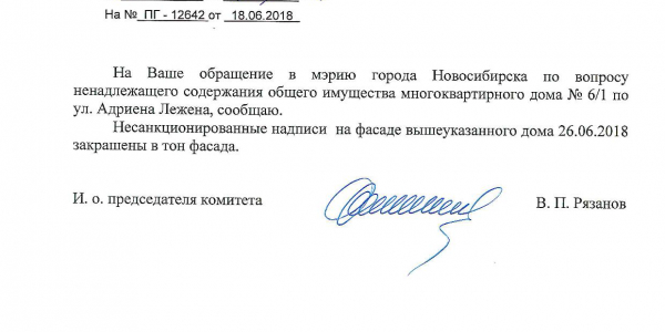 Номер жалобы:35942 Тип жалобы:Иные проблемы ЖКХ Название объекта:Управляющая Компания Регион:Новосибирская область Город:Новосибирск Адрес:ул. Адриена Лежена, 6/1 Описание жалобы:Надписи на фасаде дома Статус: