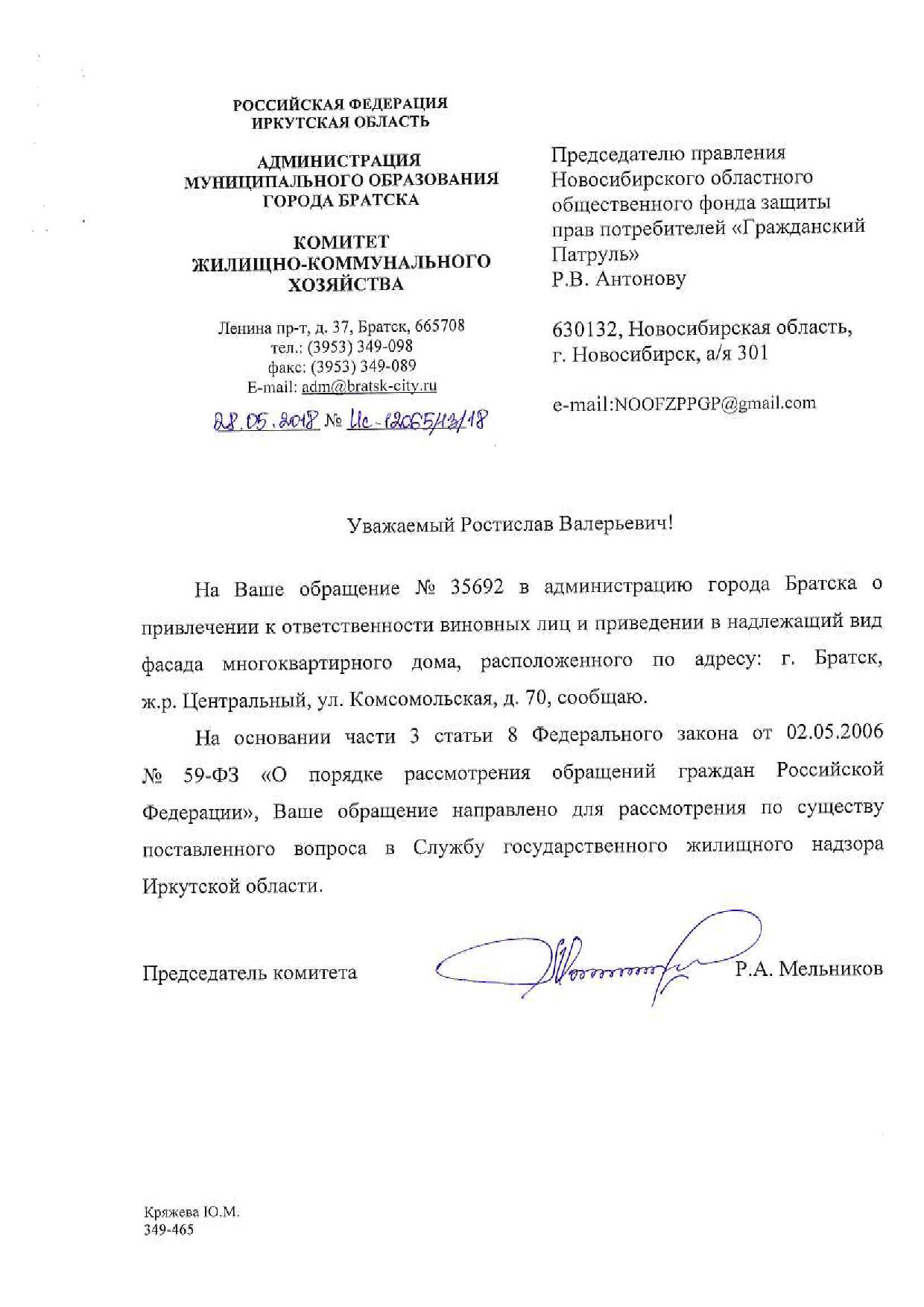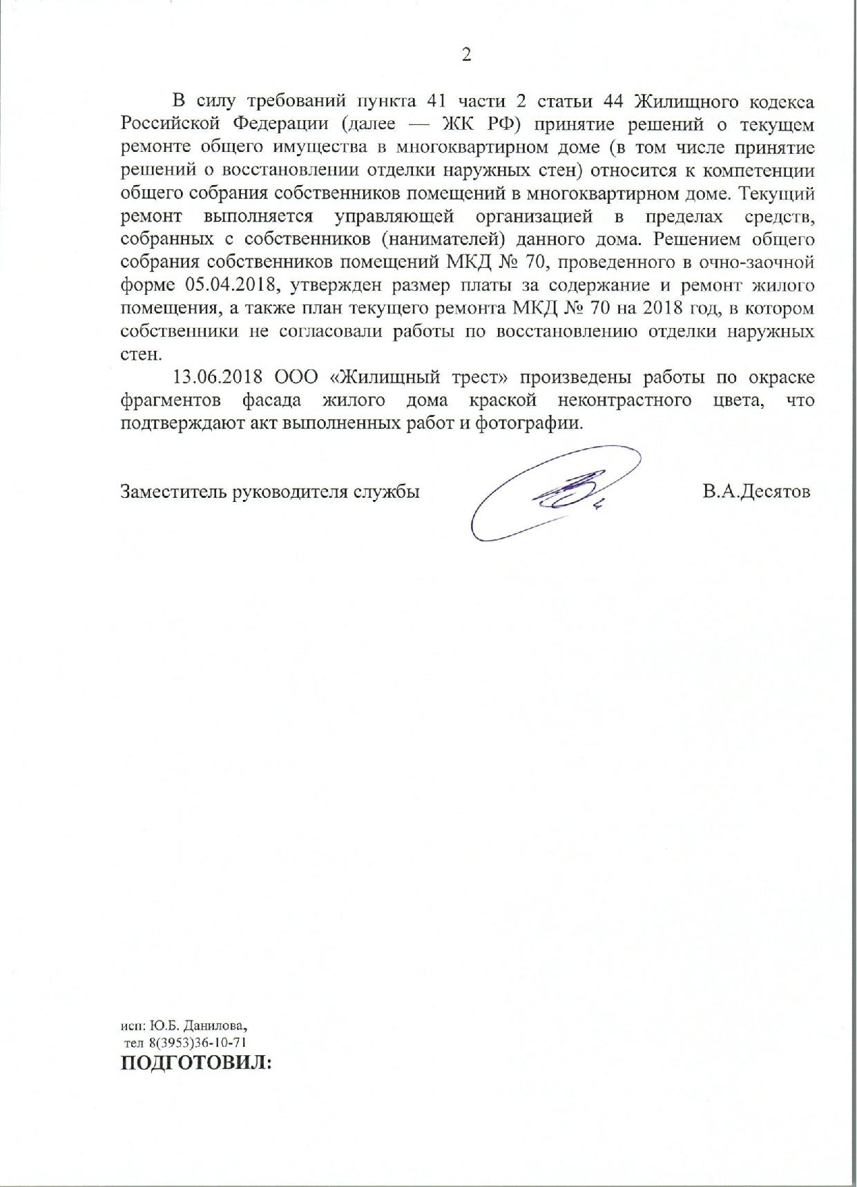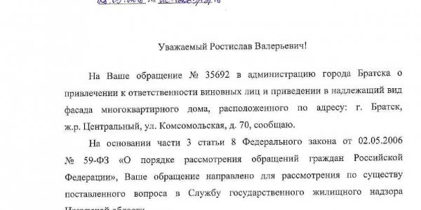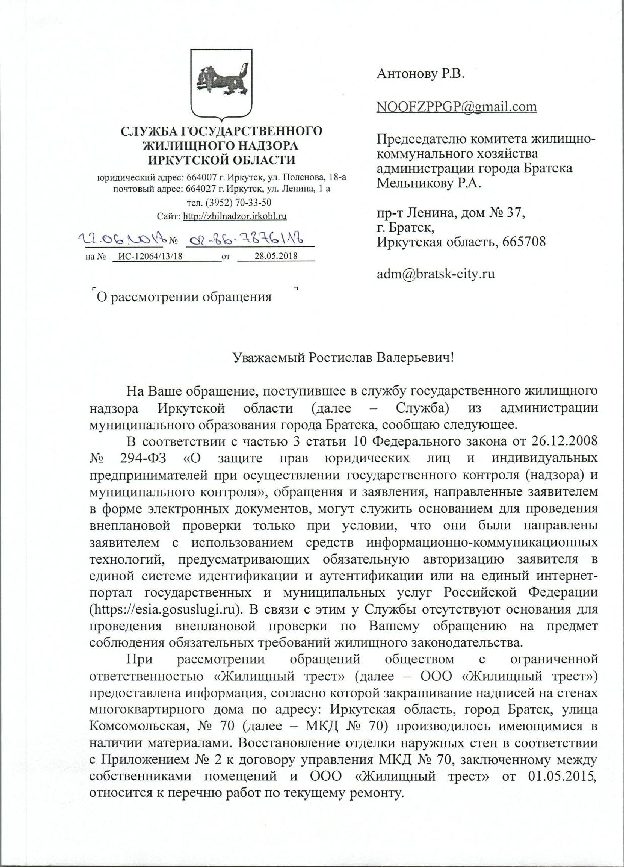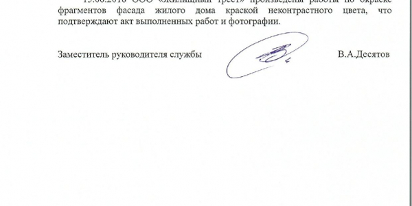 Номер жалобы:35692 Тип жалобы:Иные проблемы ЖКХ Название объекта:ООО "Жилищный Трест" Регион:Иркутская область Город:Братск Адрес:26-й мкр., Описание жалобы:По ул. Комсомольская, д.70, вандальные надписи на стенах домов закрашены контрастной краской - коричневые стены зеленой и белой краской, а белые - зеленой краской. Лучше бы тогда вообще не закрашивали, надписи и то не так бросались в глаза. Статус: