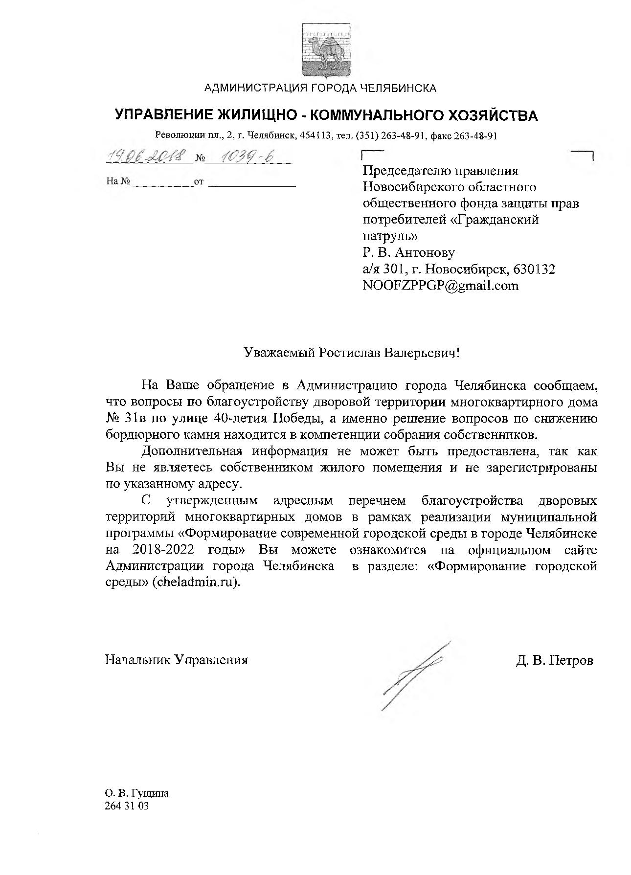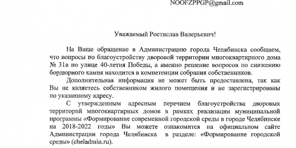 Номер жалобы:35711 Тип жалобы:Иные проблемы ЖКХ Название объекта:УК Строитель 97 Город:Челябинск Адрес:Челябинск, улица 40-летия Победы, 31В Описание жалобы:Необходимо сделать занижения бордюров в тех местах, где передвигаются люди с детскими колясками и люди с ограниченными возможностями, включая 3 подъезд дома 31в по улице 40 лет Победы. Статус: