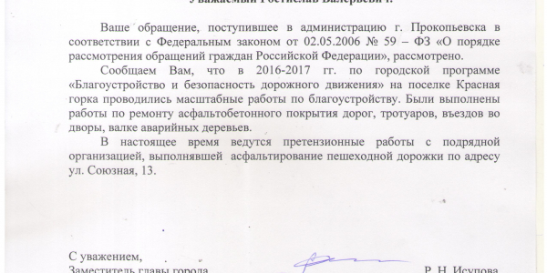 Номер жалобы:35781 Тип жалобы:Иные проблемы ЖКХ Название объекта:7 Регион:Кемеровская область Город:Прокопьевск Адрес:ул. Союзная, 13 Описание жалобы:Пешеходная дорожка. Лужа и грязь Статус: