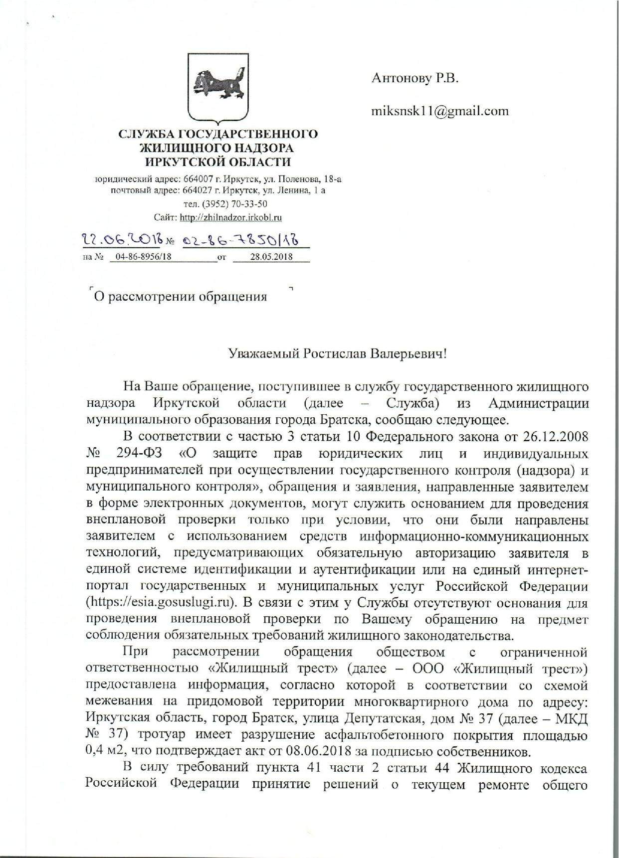 Номер жалобы:35475 Тип жалобы:Иные проблемы ЖКХ Название объекта: Регион:Иркутская область Город:Братск Адрес:Депутатская улица, 37 Описание жалобы:Разрушен тротуар Статус: