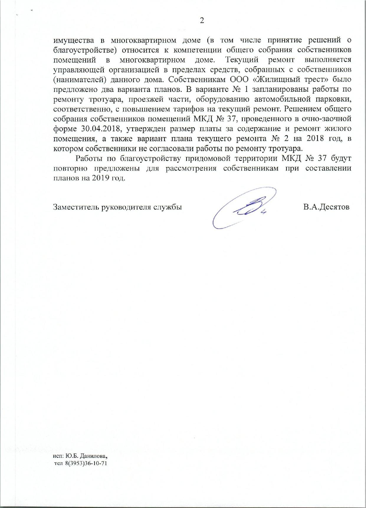 Номер жалобы:35473 Тип жалобы:Иные проблемы ЖКХ Название объекта: Регион:Иркутская область Город:Братск Адрес:Депутатская улица, 37 Описание жалобы:Необходимо устройство парковки во дворе или установка ограждения Статус: