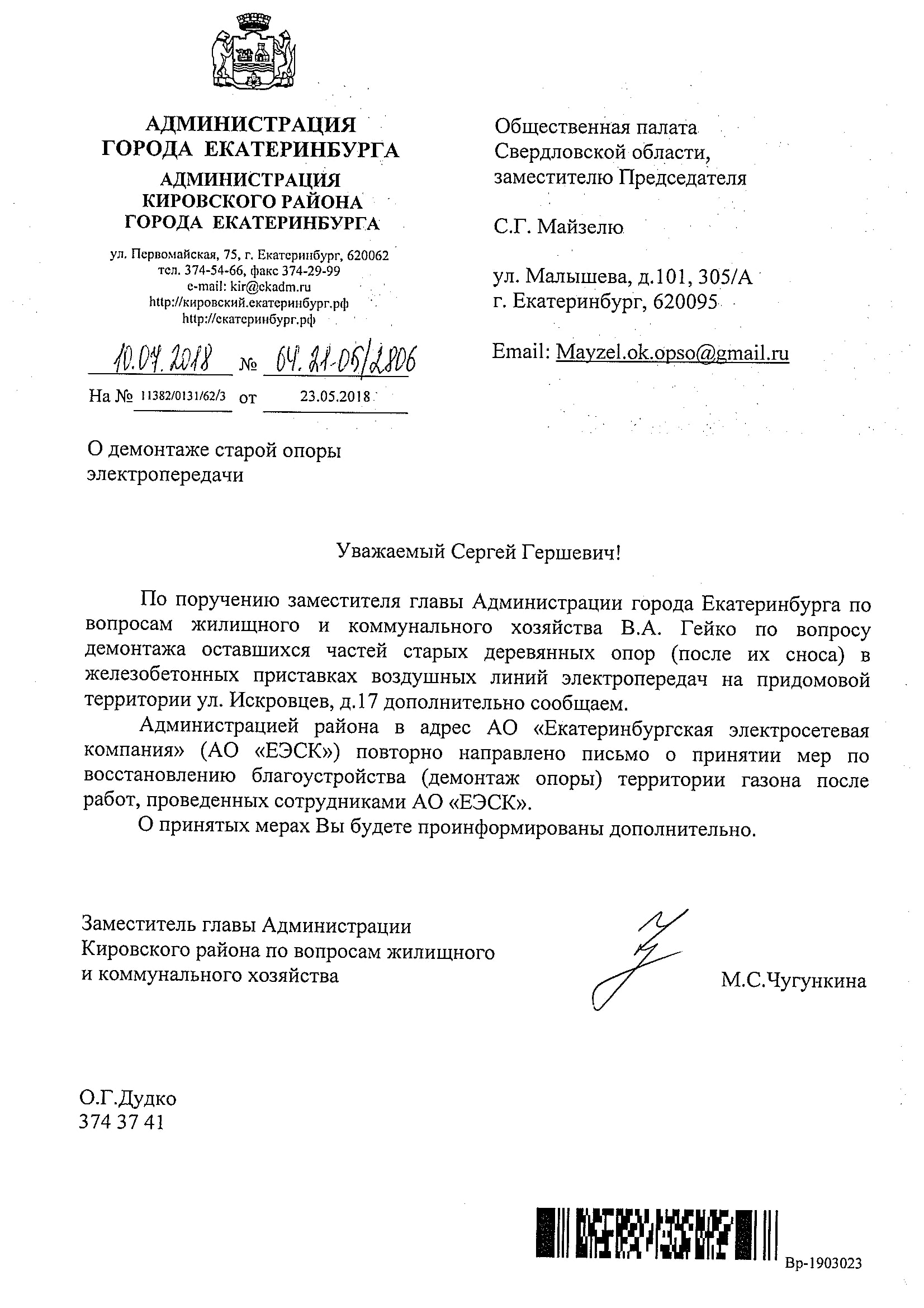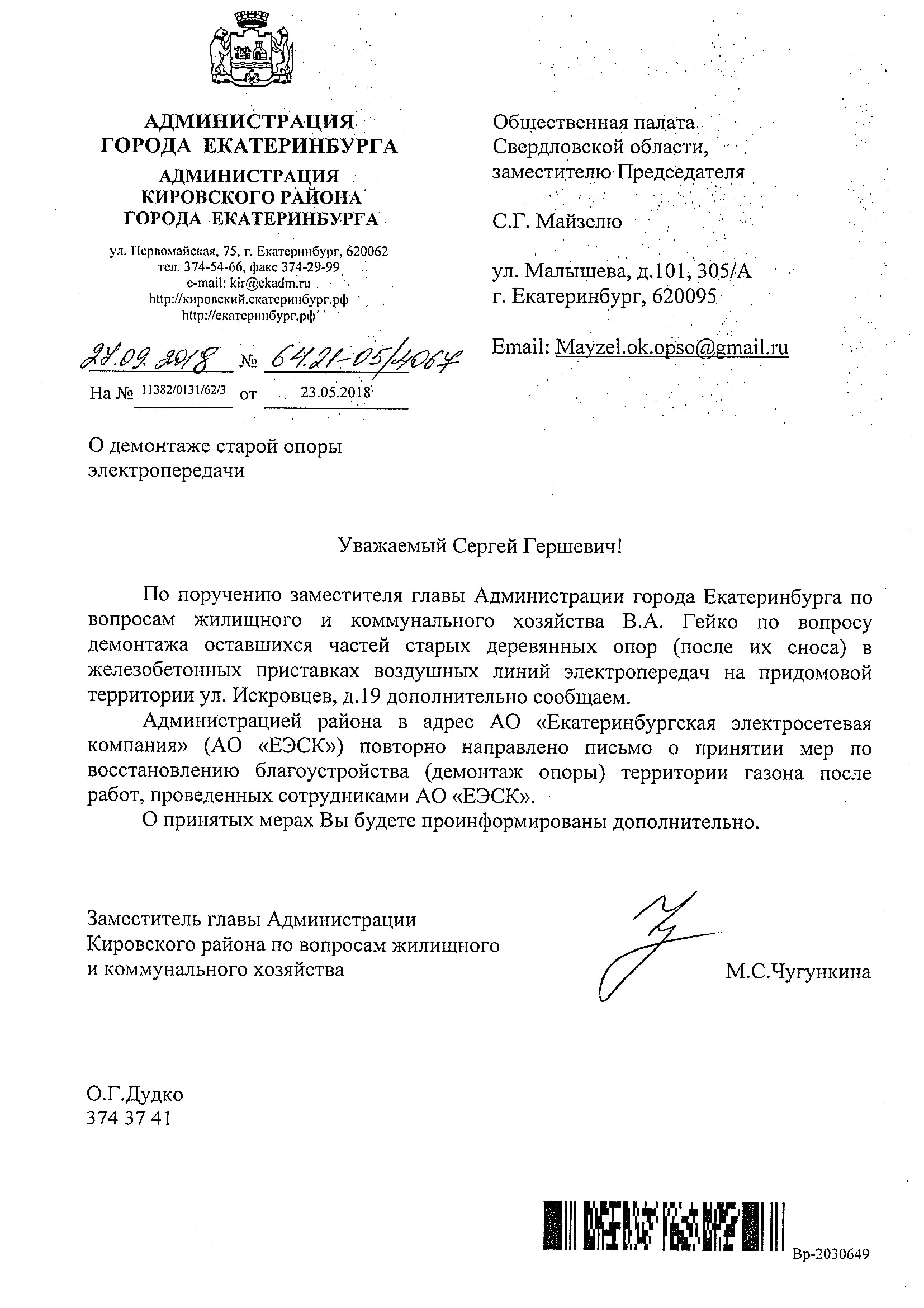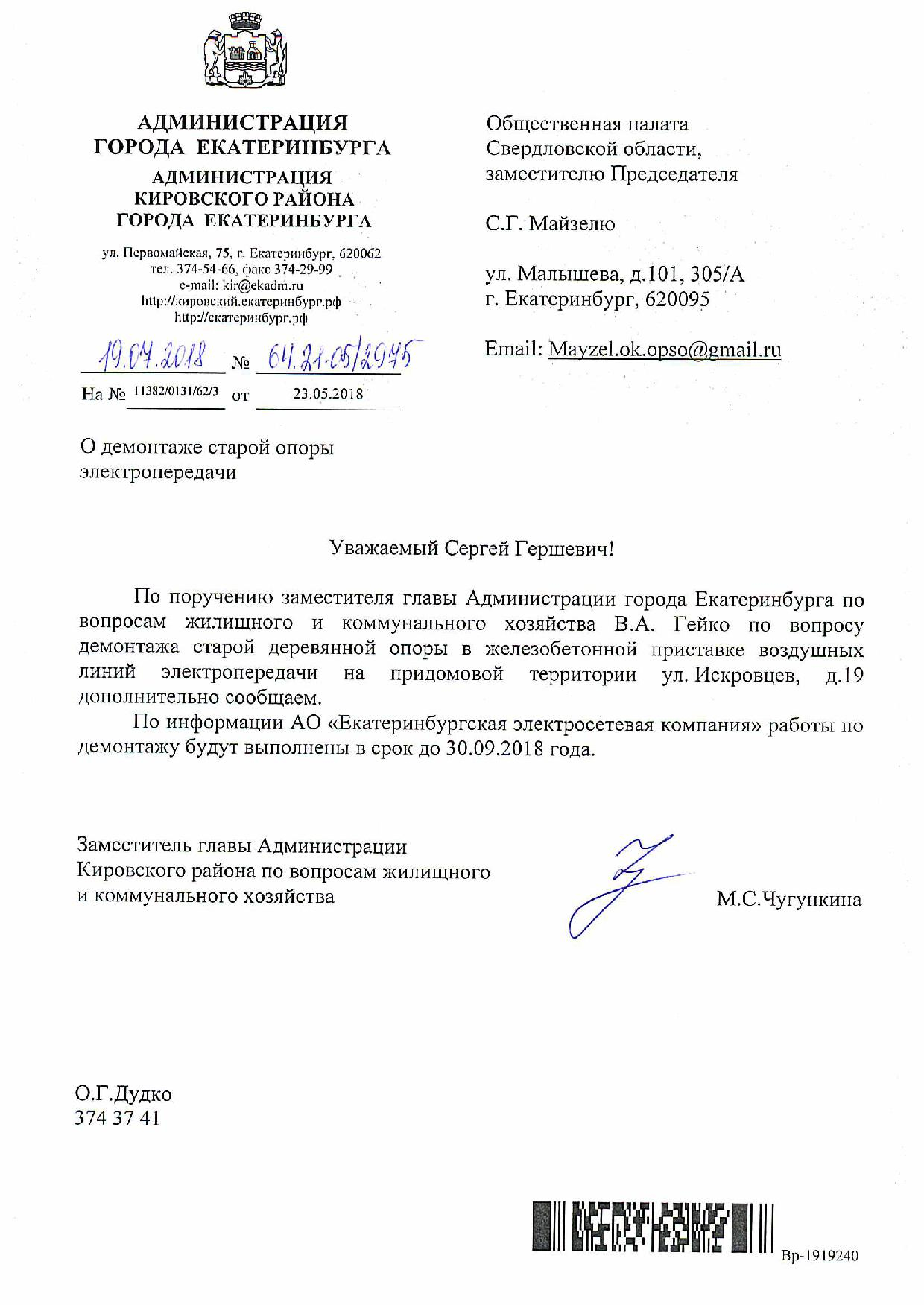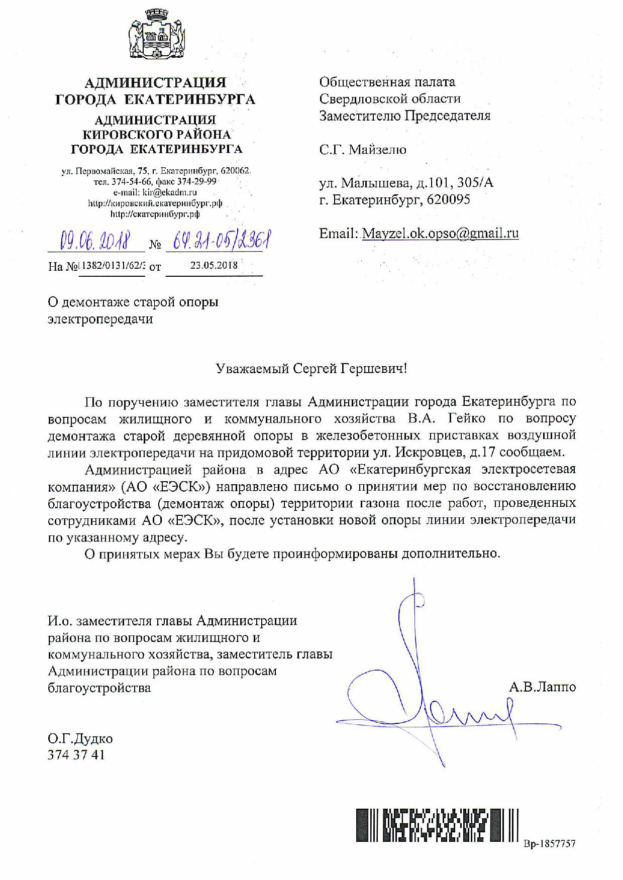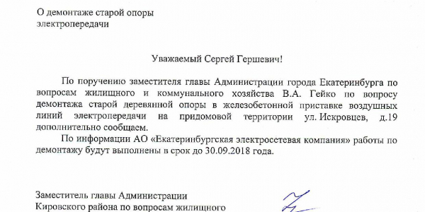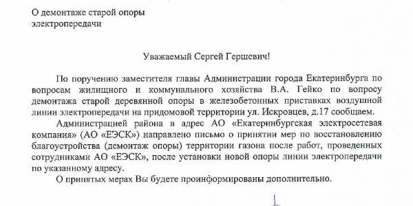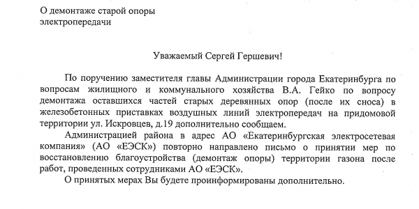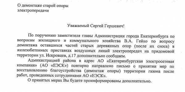 Номер жалобы:35583 Тип жалобы:Иные проблемы ЖКХ Название объекта:ЕЭСК Регион:Свердловская область Город:Екатеринбург Адрес:ул. Искровцев, 17 Описание жалобы:Просьба убрать старую опору . Статус: