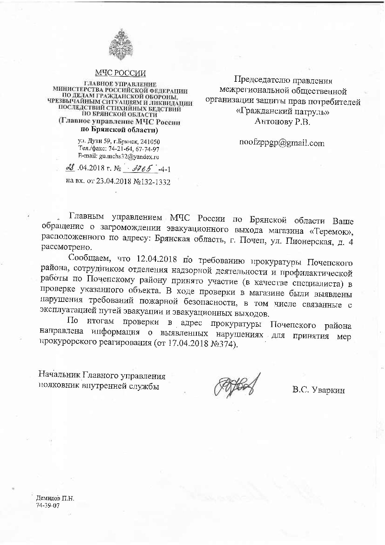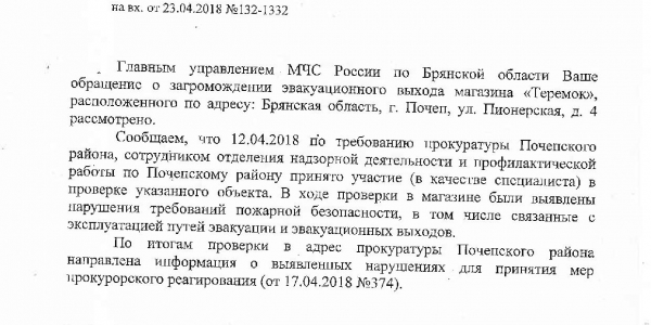 Номер жалобы:35528 Тип жалобы:Проблемы ЖКХ / дворы - Иные проблемы ЖКХ Название объекта: Регион:Брянская область Город:г. Почеп Адрес:ул. Пионерская, 4 Описание жалобы:ЖДЕМ СВЕЖИЕ ФОТО Центральный вход в магазин "Теремок" до сих пор захламлен. В МЧС и прокуратуру. Статус: