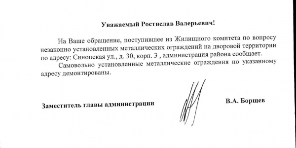 Номер жалобы:35497 Тип жалобы:Иные проблемы ЖКХ Название объекта:. Город:Санкт-Петербург Адрес:Санкт-Петербург, Синопская набережная, 30, 3 Описание жалобы:На дворовой территории незаконно установлены металлические столбики с цепями на замке. Сотрудники офиса таким образом захватили часть территории двора для парковки своих автомобилей. Статус:
