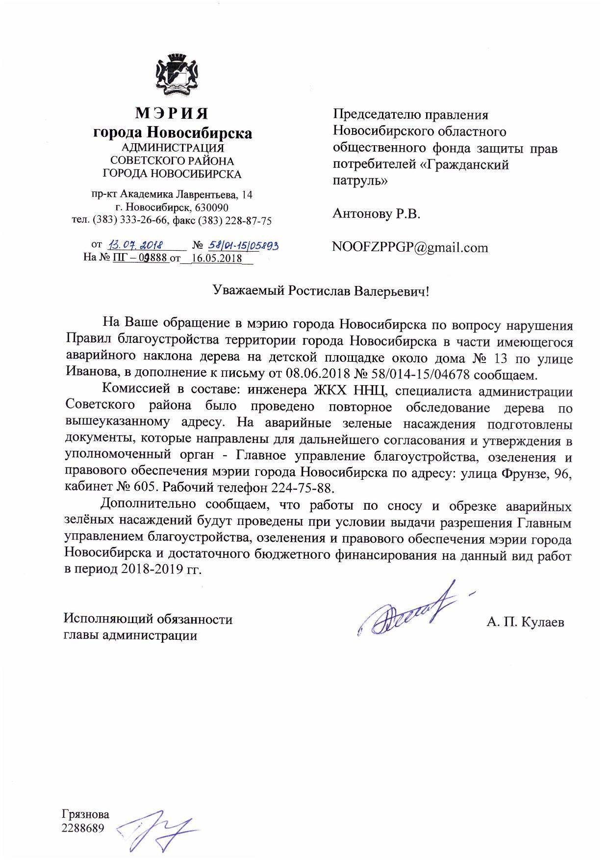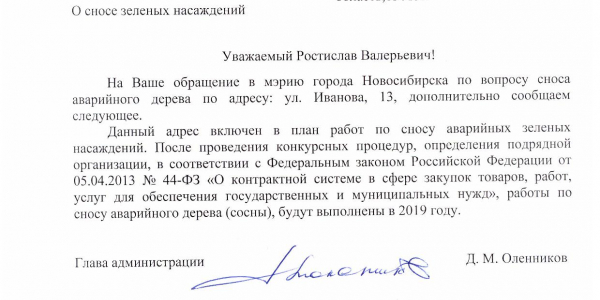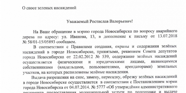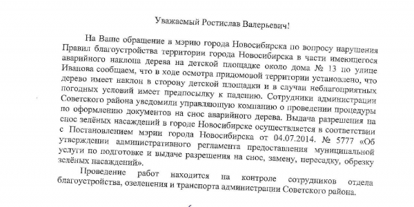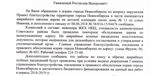 Номер жалобы:35315 Тип жалобы:Иные проблемы ЖКХ Название объекта:ЖКХ √7 Регион:Новосибирская область Город:Новосибирск Адрес:ул. Иванова, 13 Описание жалобы:Критический наклон сосны над детской площадкой Статус: