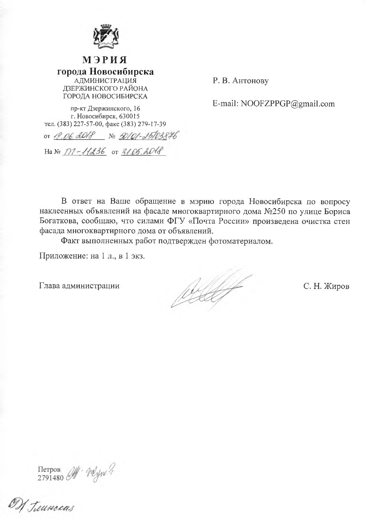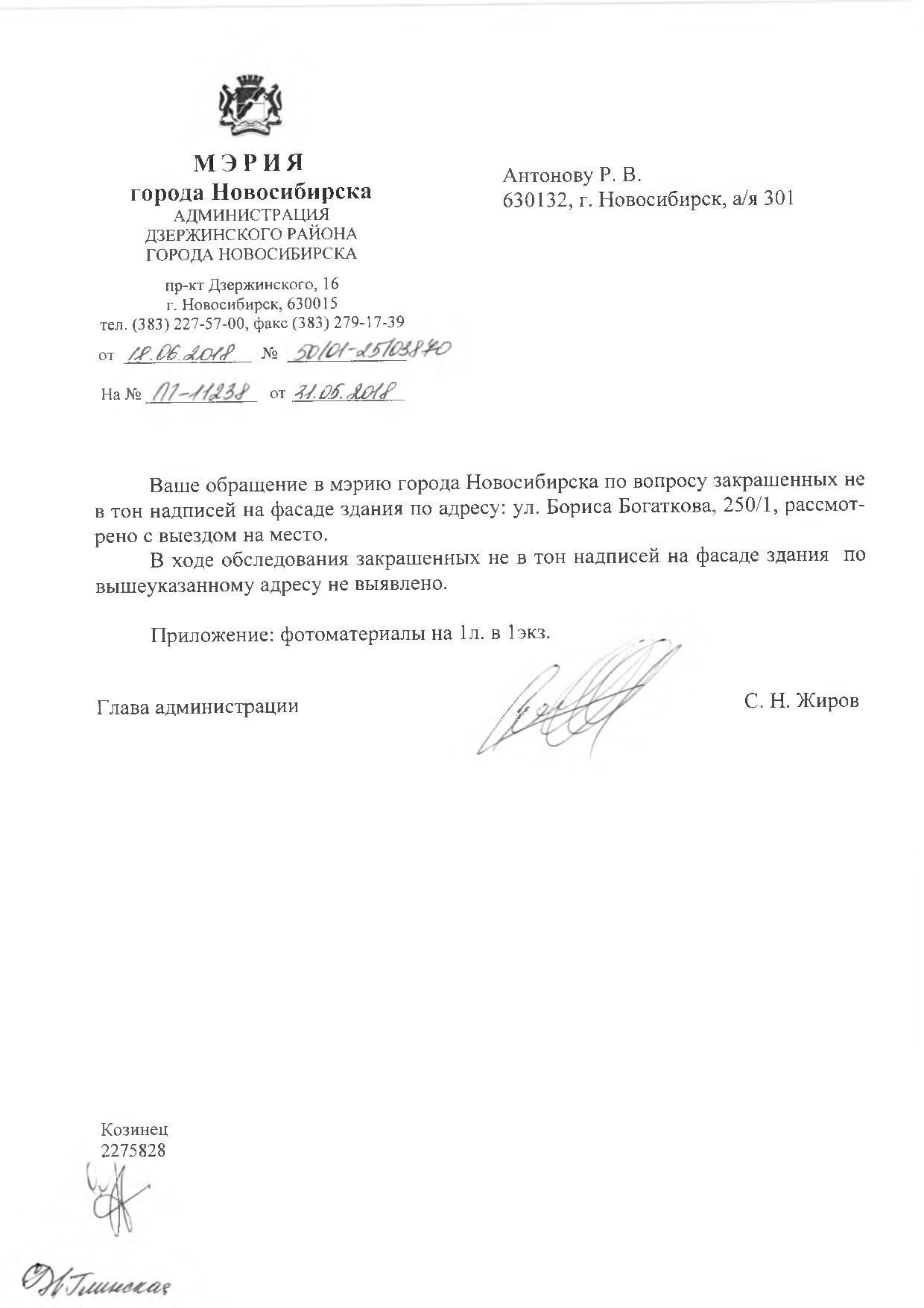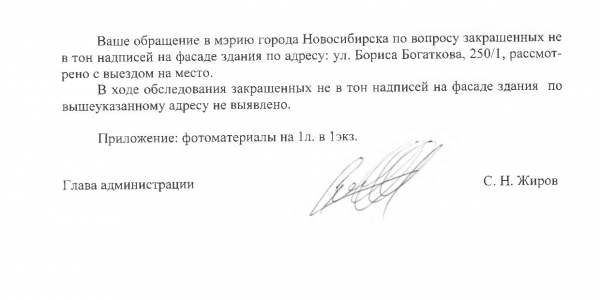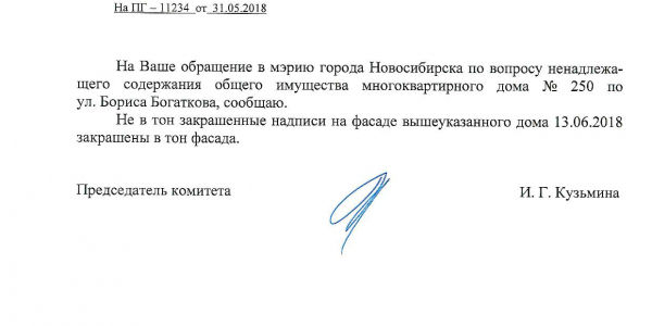 Номер жалобы:35225 Тип жалобы:Иные проблемы ЖКХ Название объекта:Управляющая Компания Регион:Новосибирская область Город:Новосибирск Адрес:ул. Бориса Богаткова, 250 Описание жалобы:Бориса богаткова 250/1,Надписи закрашены не в тон Статус: