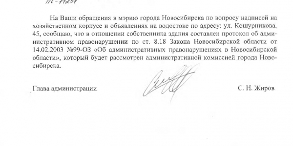 Номер жалобы:35224 Тип жалобы:Иные проблемы ЖКХ Название объекта:Управляющая Компания Регион:Новосибирская область Город:Новосибирск Адрес:ул. Кошурникова, 45 Описание жалобы:Надписи на хозяйственном корпусе Статус: