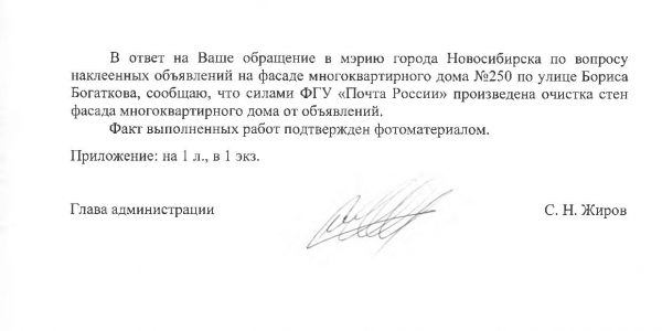 Номер жалобы:35220 Тип жалобы:Иные проблемы ЖКХ Название объекта:Управляющая Компания Регион:Новосибирская область Город:Новосибирск Адрес:ул. Бориса Богаткова, 248 Описание жалобы:Объявления в неположенном месте Статус: