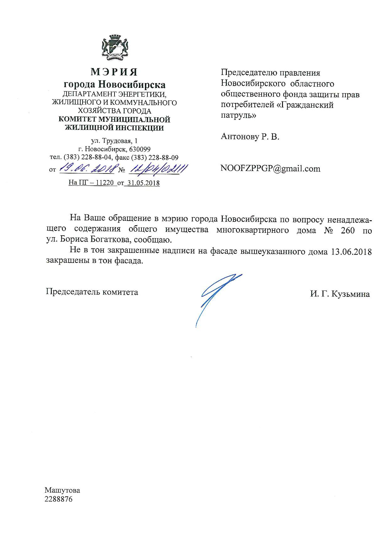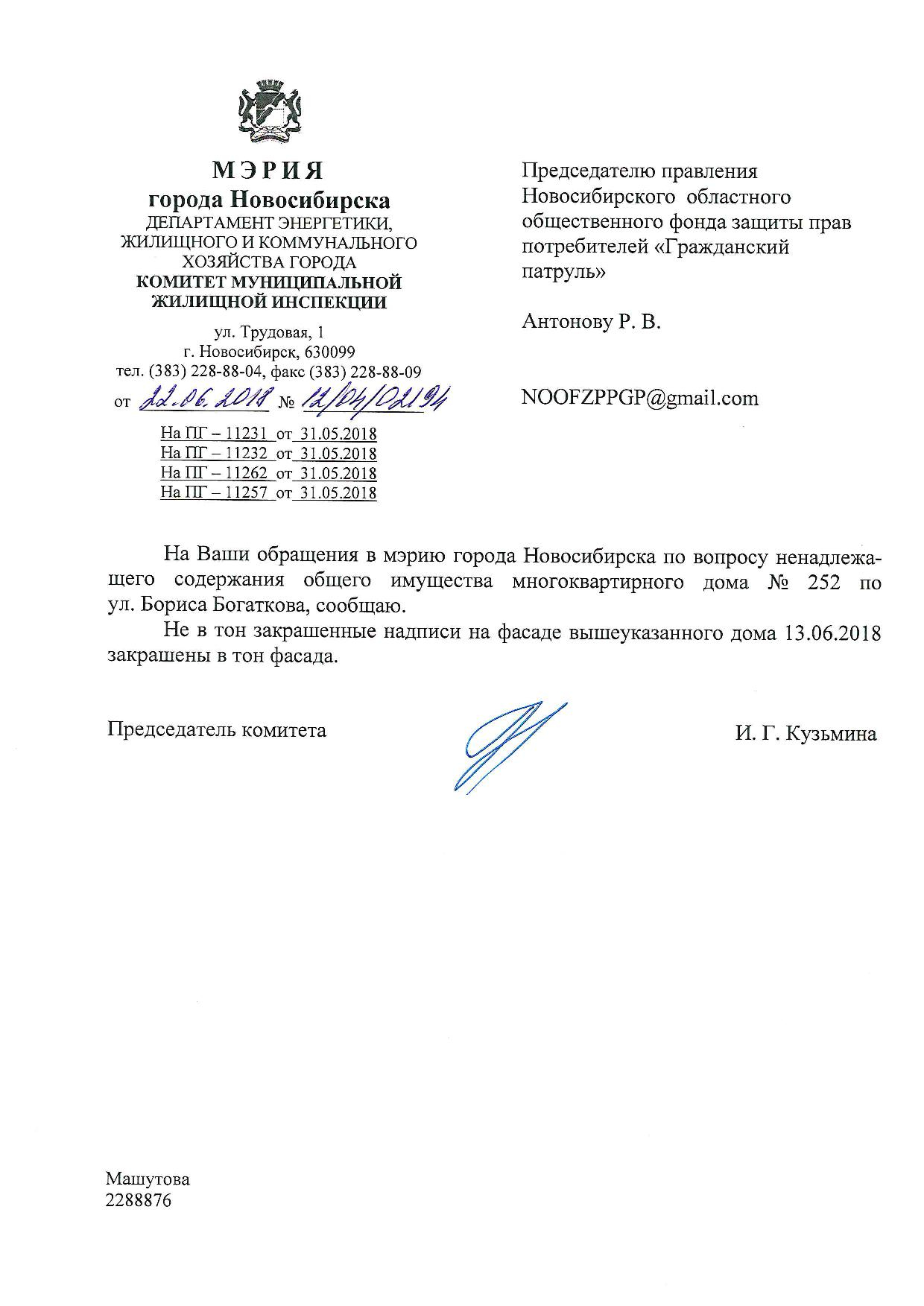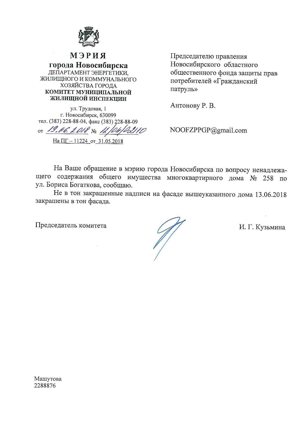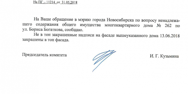 Номер жалобы:35208 Тип жалобы:Иные проблемы ЖКХ Название объекта:Управляющая Компания Регион:Новосибирская область Город:Новосибирск Адрес:ул. Бориса Богаткова, 262 Описание жалобы:Надписи закрашены не в тон Статус: