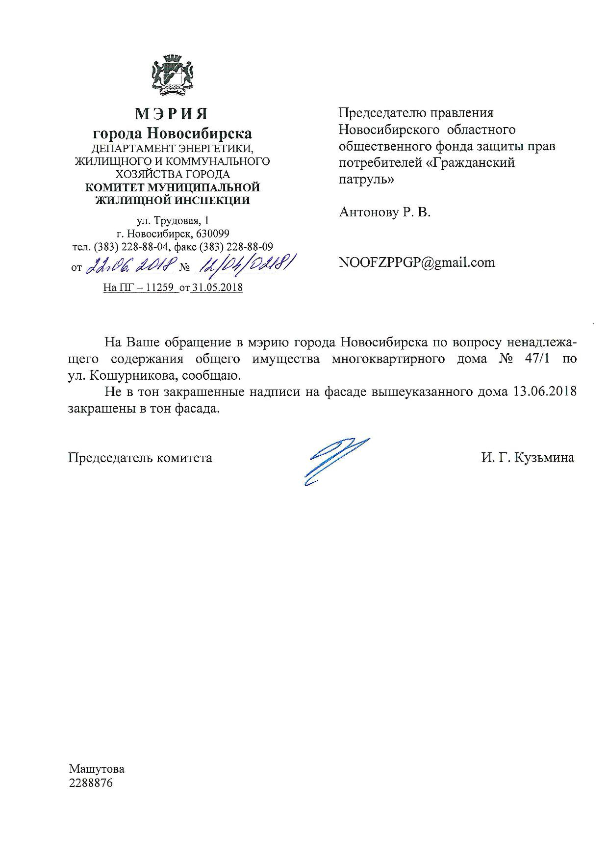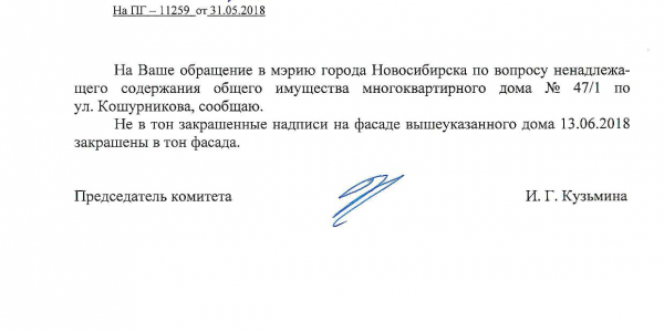 Номер жалобы:35218 Тип жалобы:Иные проблемы ЖКХ Название объекта:Управляющая Компания Регион:Новосибирская область Город:Новосибирск Адрес:ул. Кошурникова, 47/1 Описание жалобы:Надписи закрашены не в тон Статус: