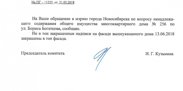 Номер жалобы:35216 Тип жалобы:Иные проблемы ЖКХ Название объекта:Управляющая Компания Регион:Новосибирская область Город:Новосибирск Адрес:ул. Бориса Богаткова, 254 Описание жалобы:Надписи закрашены не в тон Статус:
