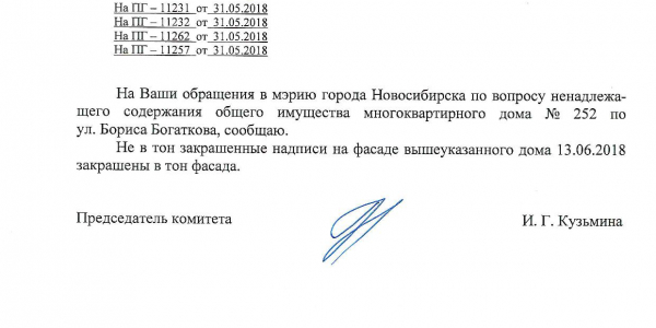 Номер жалобы:35217 Тип жалобы:Иные проблемы ЖКХ Название объекта:Управляющая Компания Регион:Новосибирская область Город:Новосибирск Адрес:ул. Бориса Богаткова, 252 Описание жалобы:Надписи закрашены не в тон Статус: