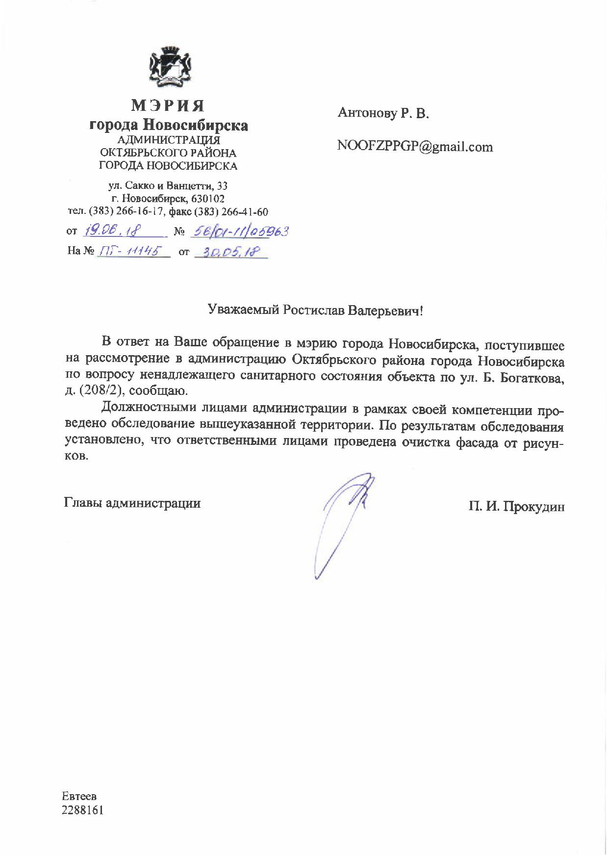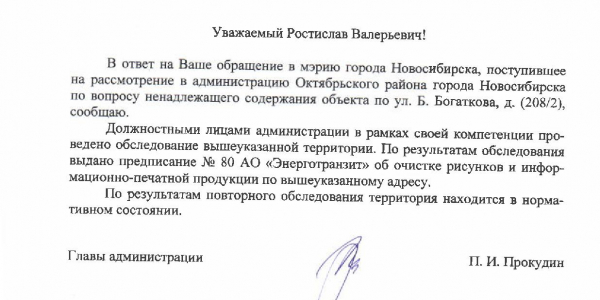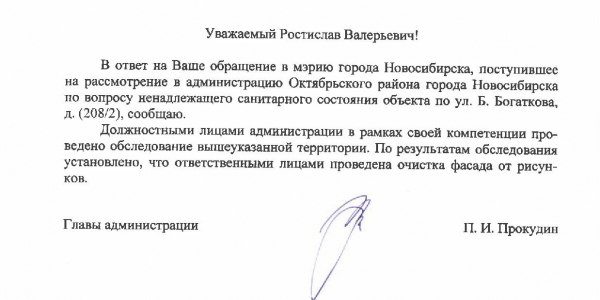 Номер жалобы:35172 Тип жалобы:Иные проблемы ЖКХ Название объекта:Управляющая Компания Регион:Новосибирская область Город:Новосибирск Адрес:ул. Бориса Богаткова, 210 Описание жалобы:Надписи на хозяйственном корпусе Статус: