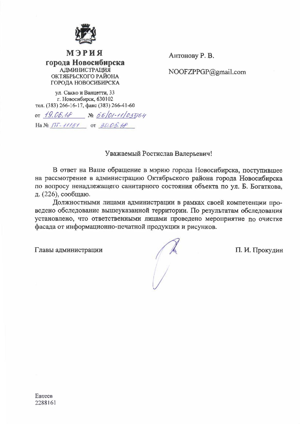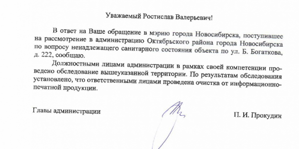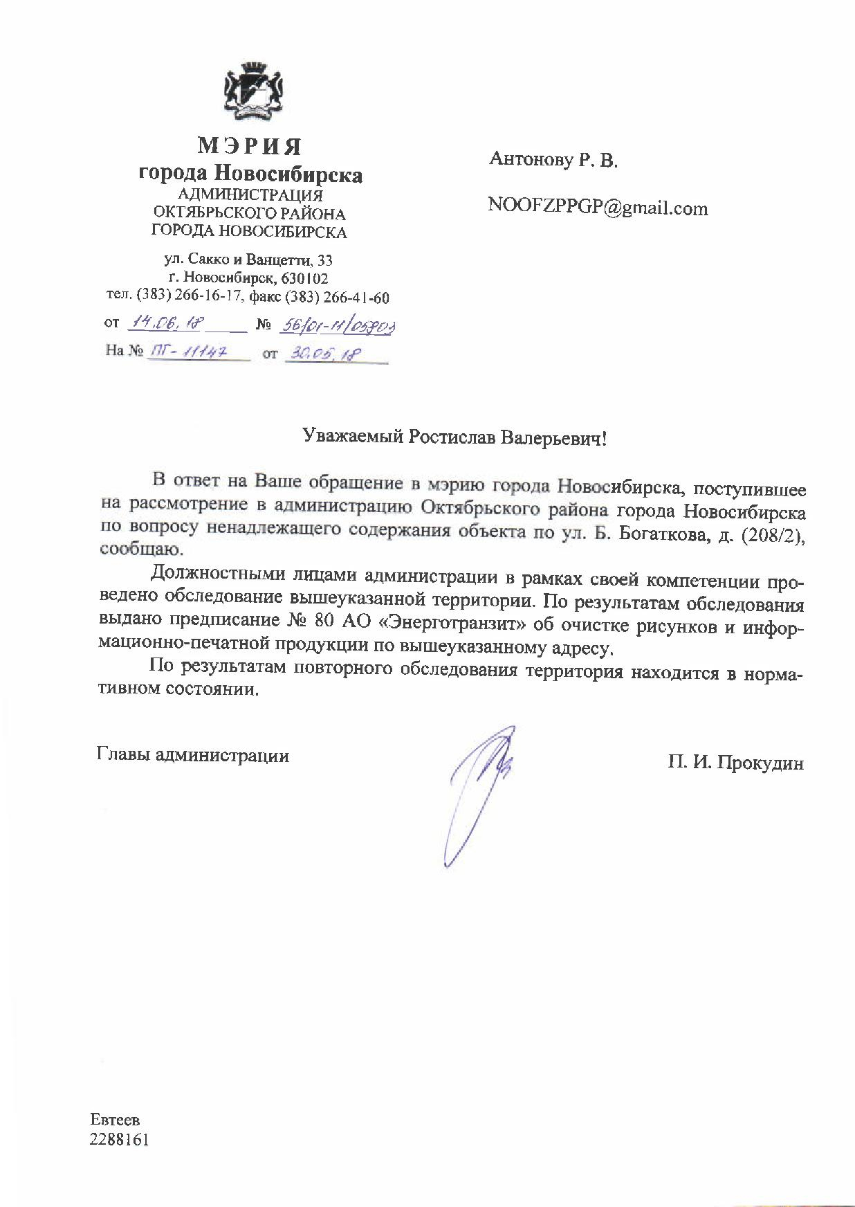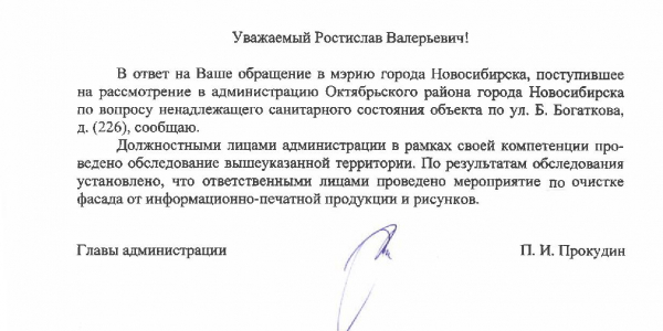 Номер жалобы:35164 Тип жалобы:Иные проблемы ЖКХ Название объекта:Управляющая Компания Регион:Новосибирская область Город:Новосибирск Адрес:ул. Бориса Богаткова, 216 Описание жалобы:Надписи и объявления на хозяйственном корпусе Статус: