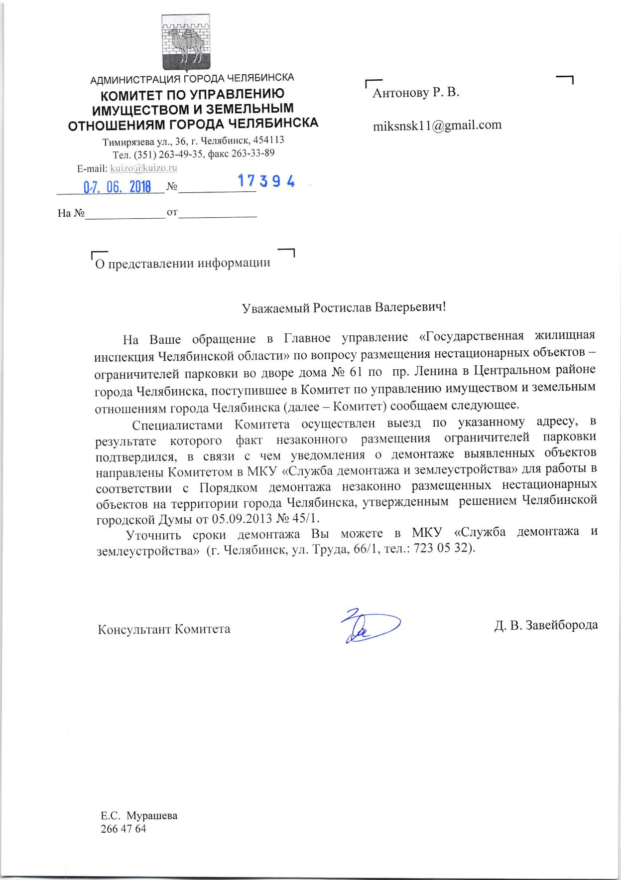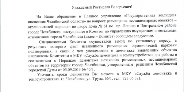 Номер жалобы:34906 Тип жалобы:Иные проблемы ЖКХ Название объекта:Ремжилзаказчик Регион:Челябинская область Город:Челябинск Адрес:пр. Ленина, 61 Описание жалобы:Во дворе незаконно установлены металлические конструкции ограничивающие передвижение транспорта. Статус: