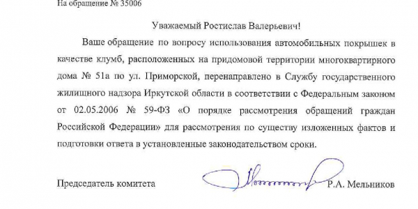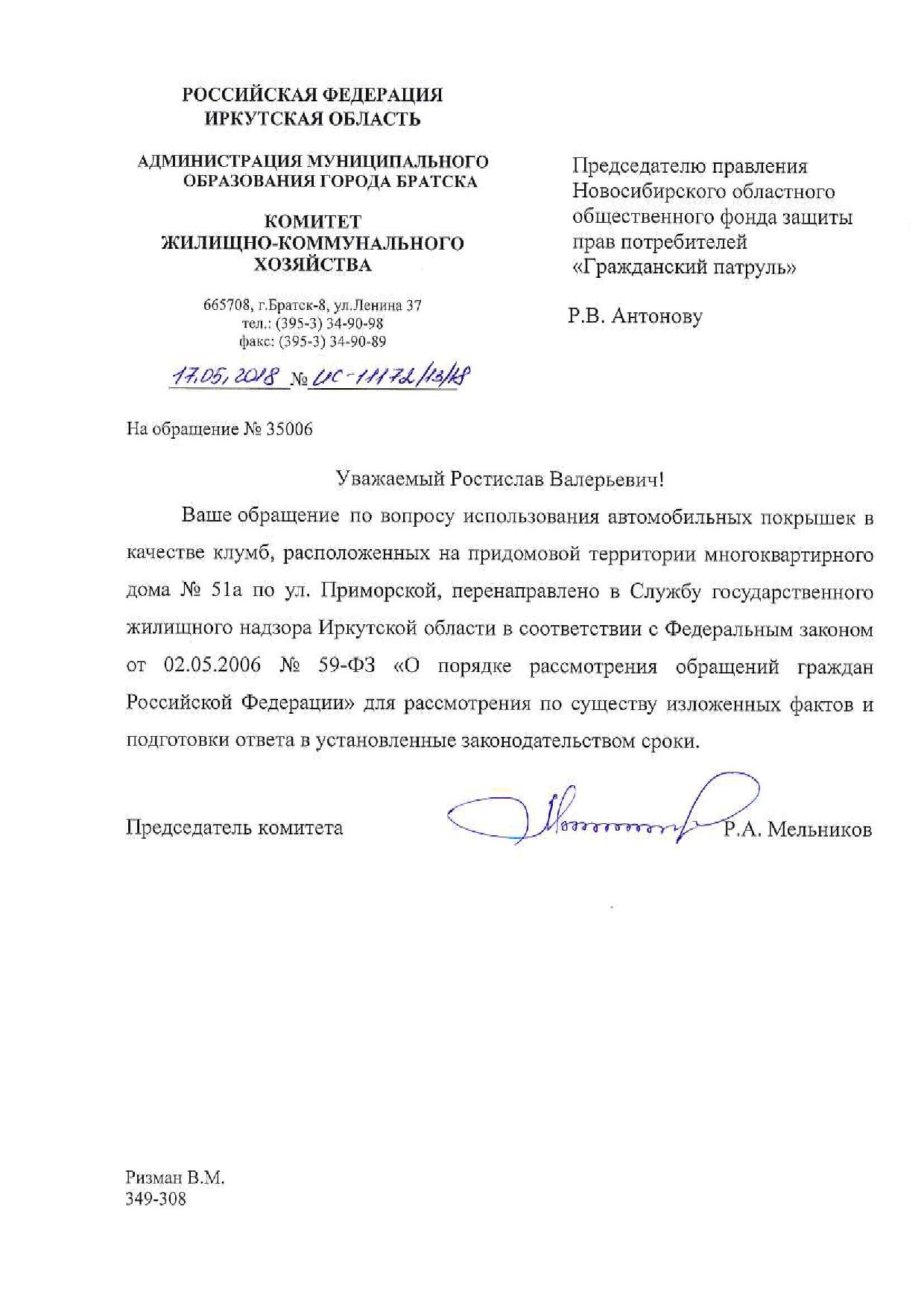 Номер жалобы:35008 Тип жалобы:Иные проблемы ЖКХ Название объекта: Регион:Иркутская область Город:Братск Адрес:улица Наймушина, 42Б Описание жалобы:Отходы 4 класса опасности (покрышки) используются в виде клумб Статус: