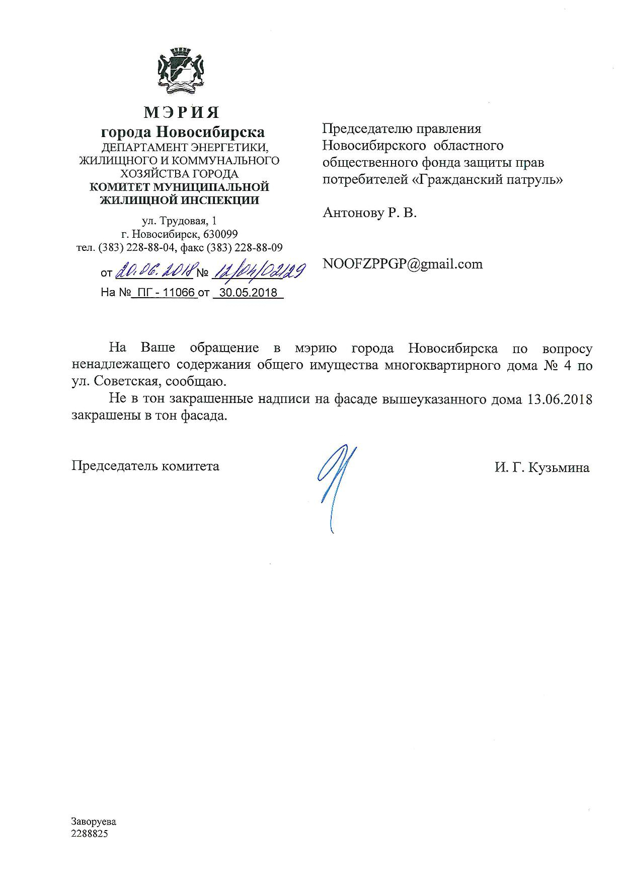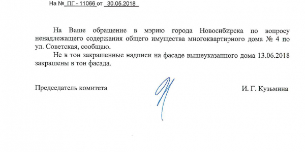Номер жалобы:34860 Тип жалобы:Иные проблемы ЖКХ Название объекта:Управляющая Компания Регион:Новосибирская область Город:Новосибирск Адрес:ул. Челюскинцев, 4 Описание жалобы:Советская 4, надписи закрашены не в тон Статус: