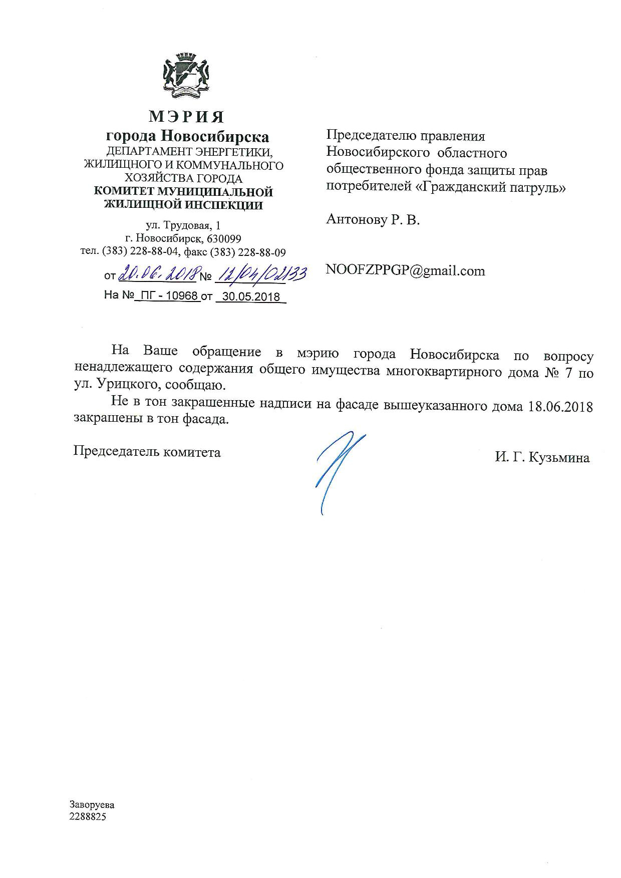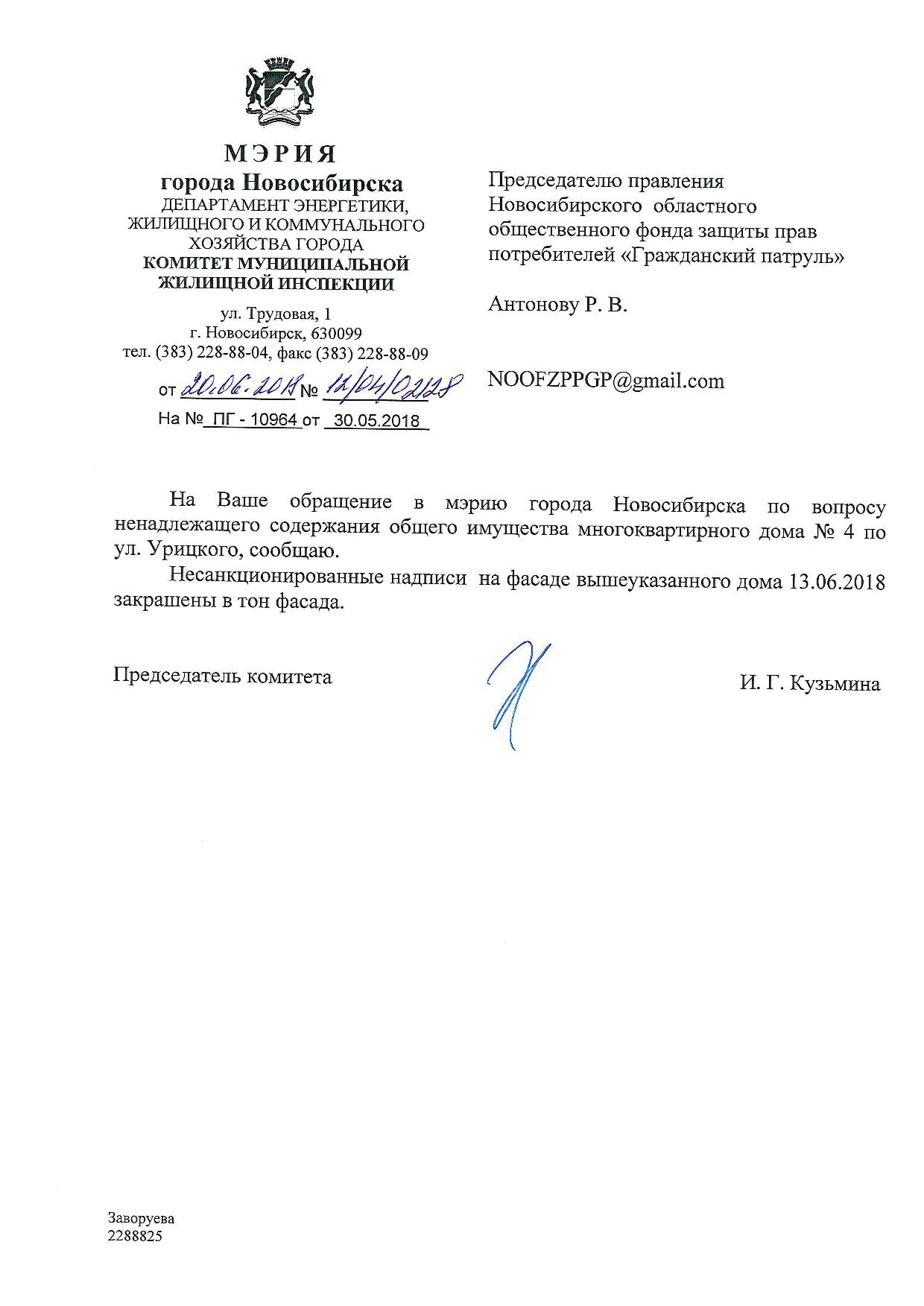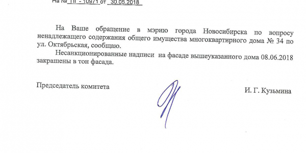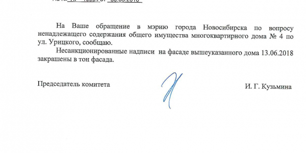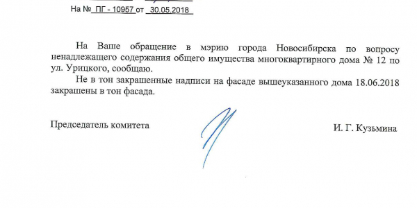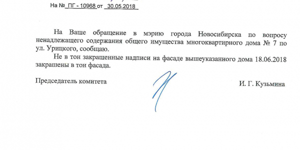 Номер жалобы:34811 Тип жалобы:Иные проблемы ЖКХ Название объекта:Управляющая Компания Регион:Новосибирская область Город:Новосибирск Адрес:ул. Урицкого, 6 Описание жалобы:Надписи Статус: