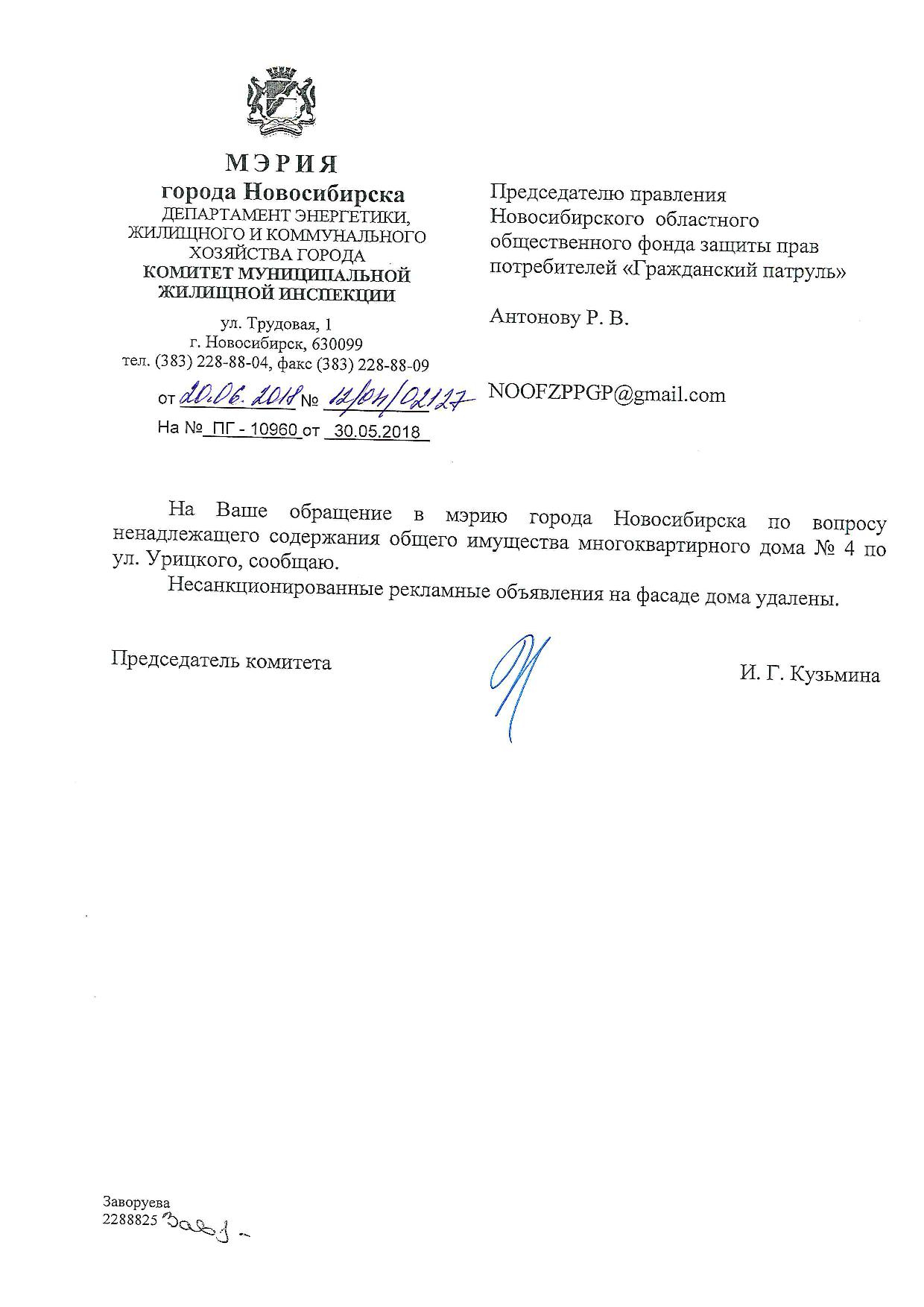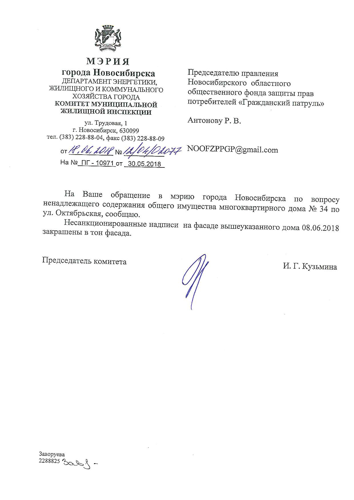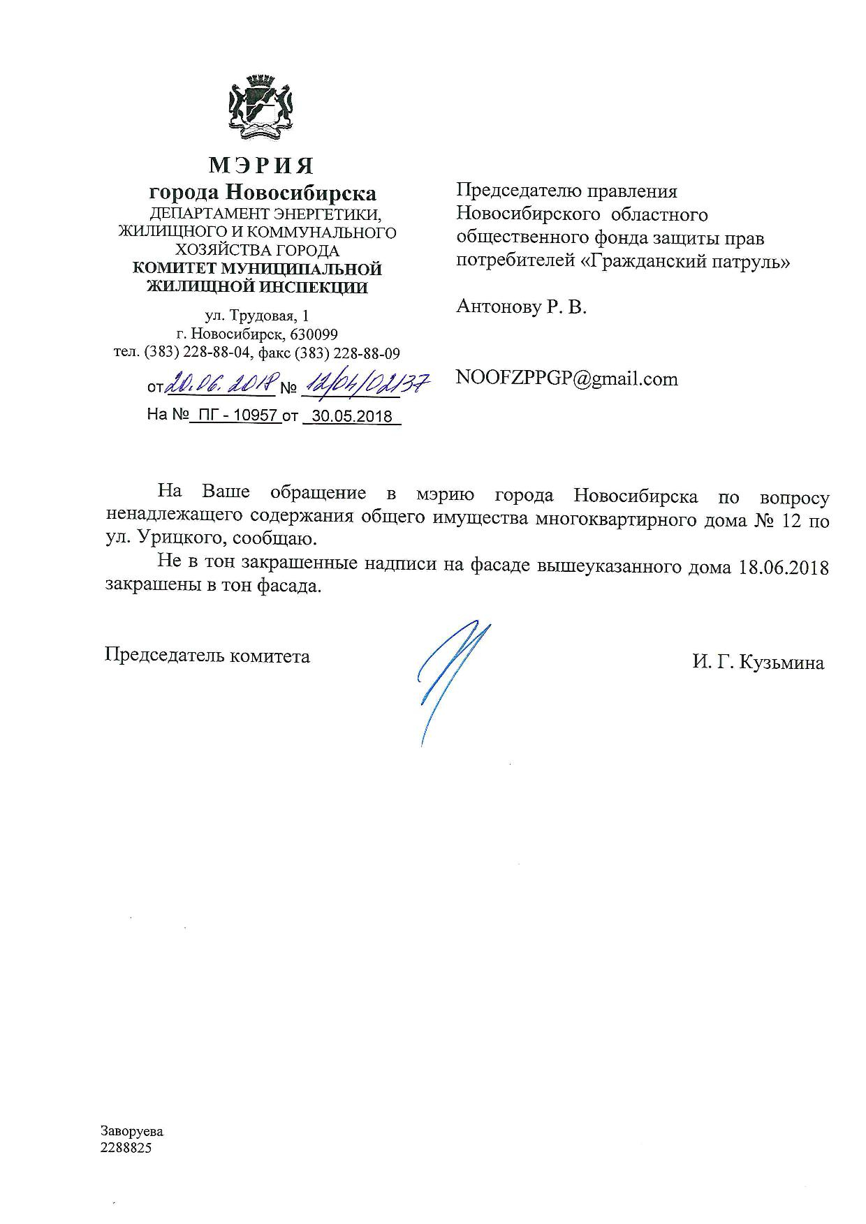 Номер жалобы:34811 Тип жалобы:Иные проблемы ЖКХ Название объекта:Управляющая Компания Регион:Новосибирская область Город:Новосибирск Адрес:ул. Урицкого, 6 Описание жалобы:Надписи Статус: