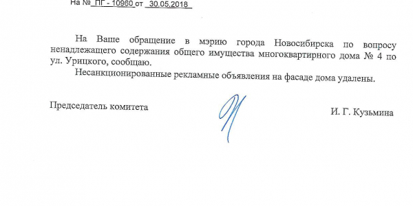 Номер жалобы:34809 Тип жалобы:Иные проблемы ЖКХ Название объекта:Управляющая Компания Регион:Новосибирская область Город:Новосибирск Адрес:ул. Урицкого, 4 Описание жалобы:Объявления на фасаде дома Статус: