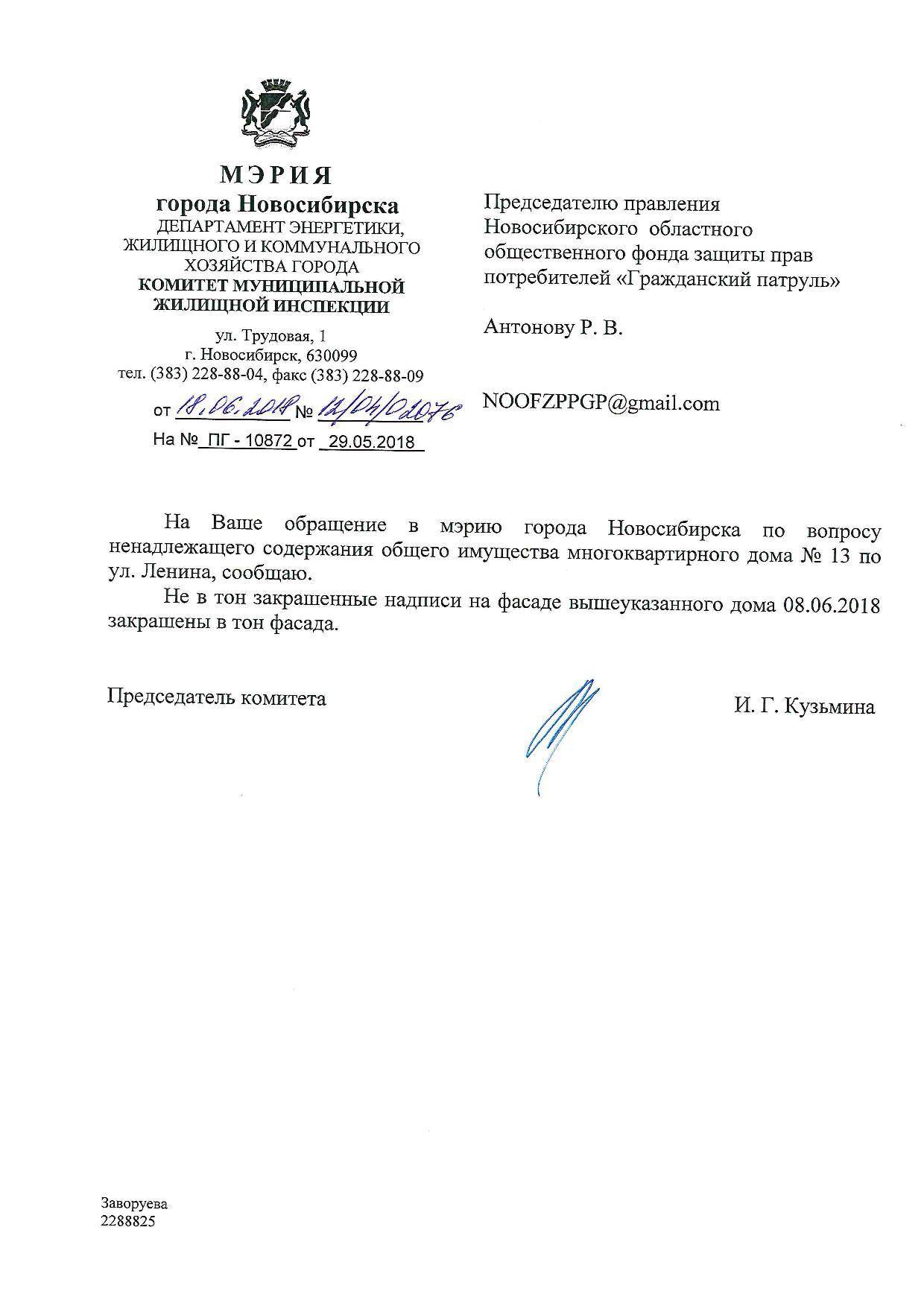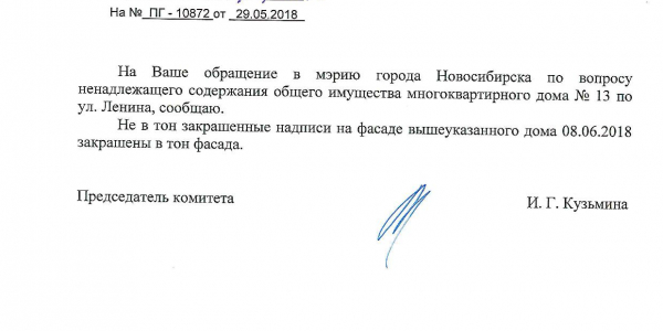 Номер жалобы:34652 Тип жалобы:Иные проблемы ЖКХ Название объекта:Управляющая Компания Регион:Новосибирская область Город:Новосибирск Адрес:ул. Ленина, 13 Описание жалобы:Надписи на фасаде дома Статус: