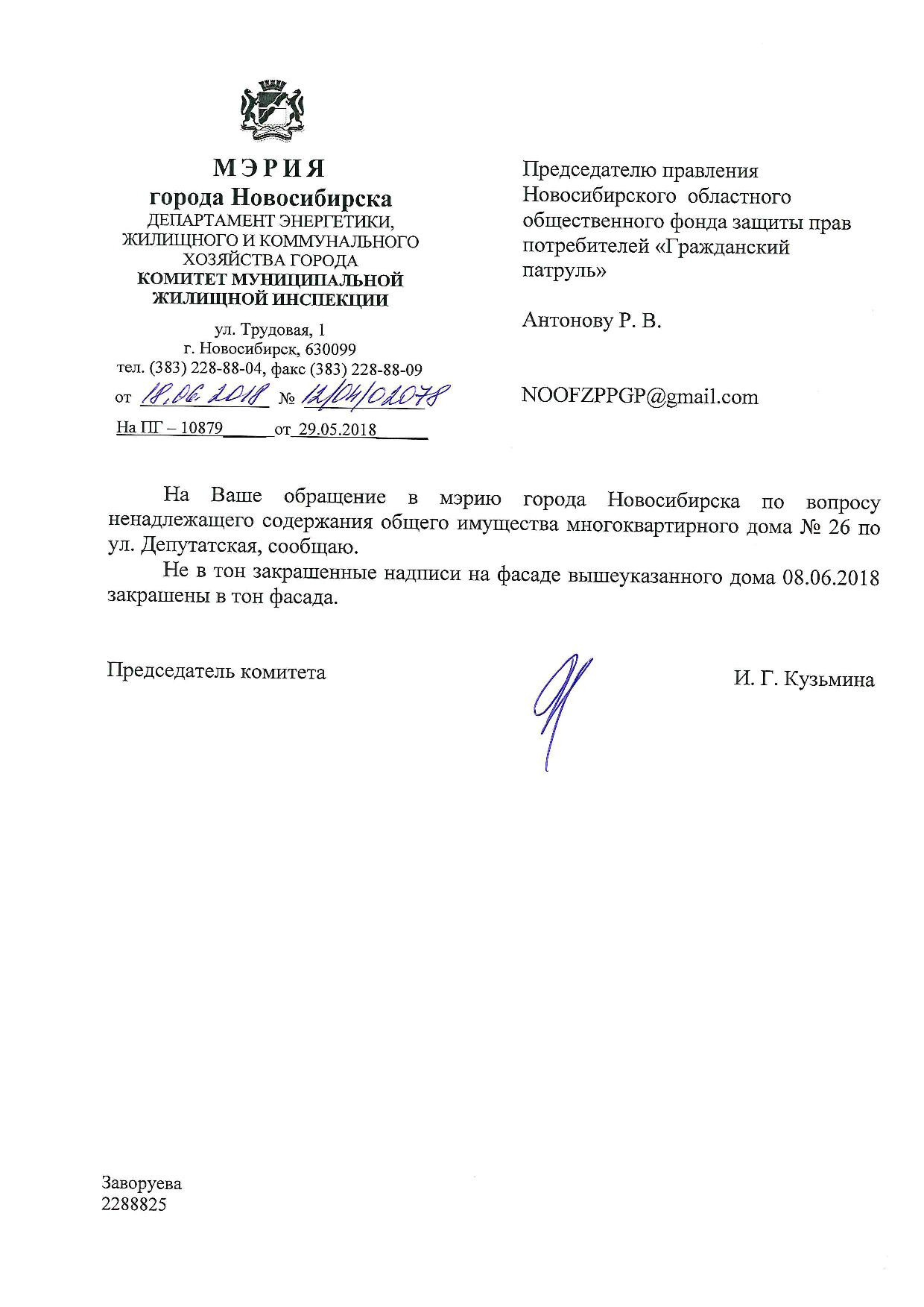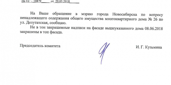 Номер жалобы:34762 Тип жалобы:Иные проблемы ЖКХ Название объекта:Управляющая Компания Регион:Новосибирская область Город:Новосибирск Адрес:Депутатская ул., 26 Описание жалобы:Надписи закрашены не в тон Статус: