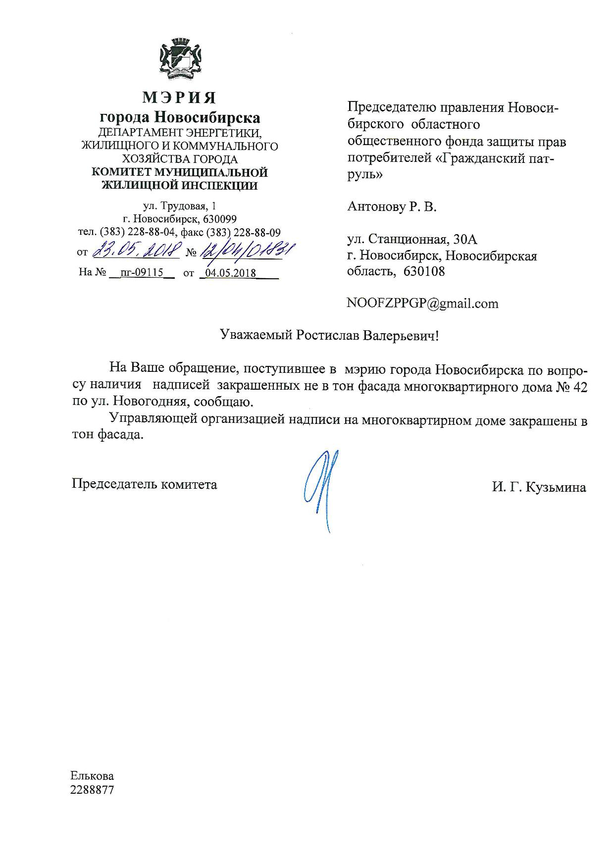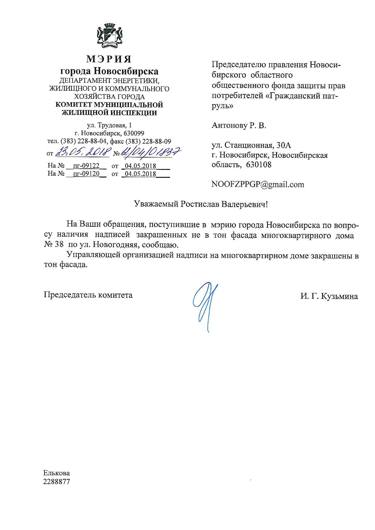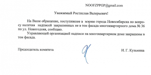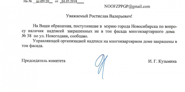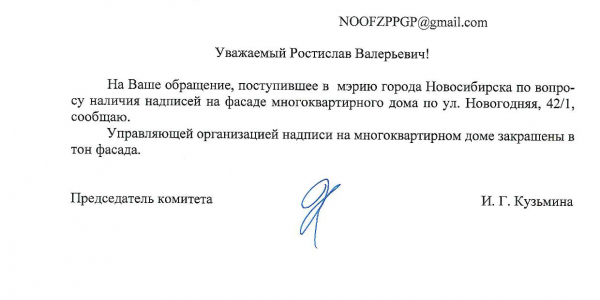 Номер жалобы:34206 Тип жалобы:Иные проблемы ЖКХ Название объекта:Управляющая Компания Регион:Новосибирская область Город:Новосибирск Адрес:ул. Новогодняя, 42 Описание жалобы:Надписи закрашены не в тон Статус: