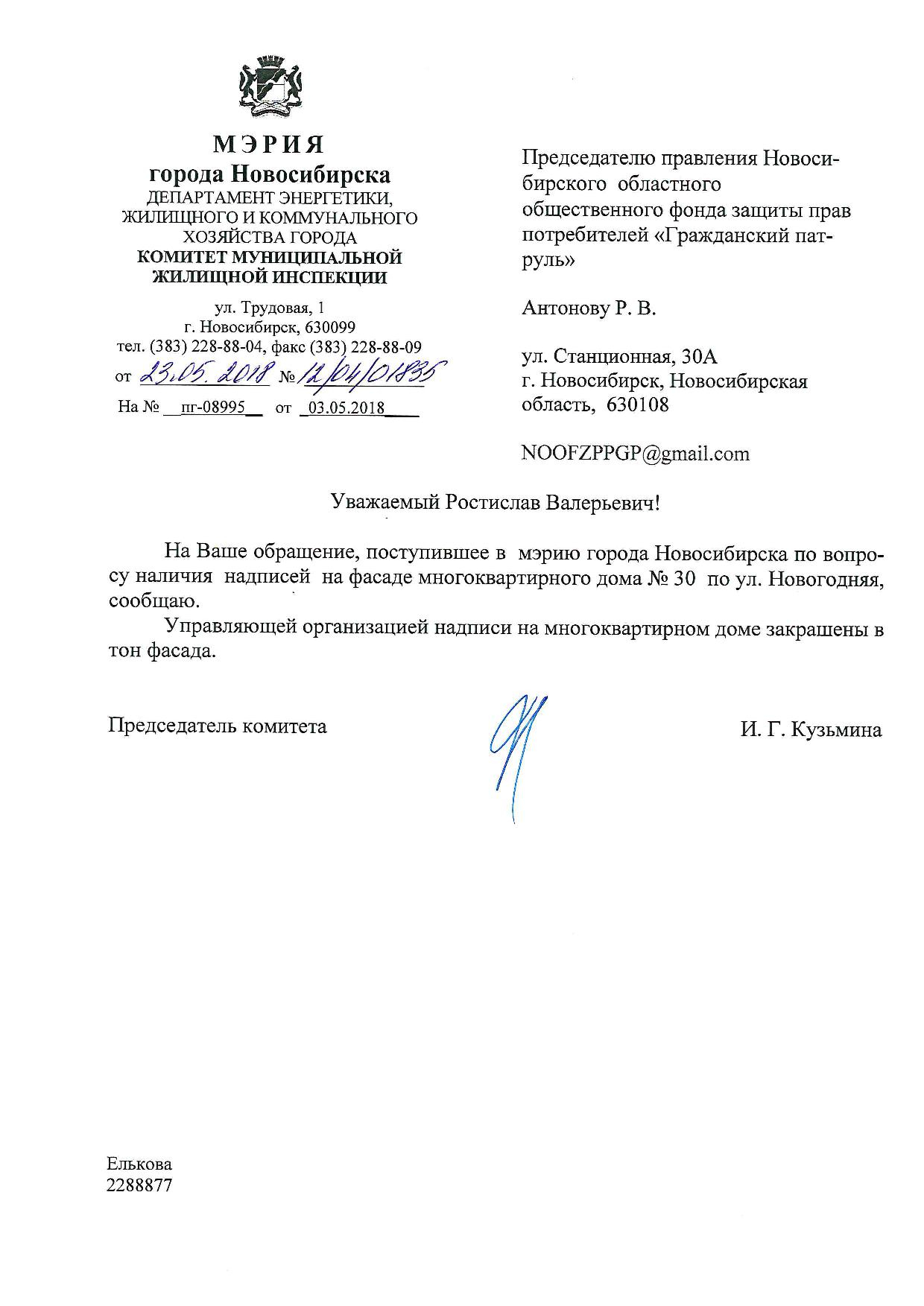 Номер жалобы:34215 Тип жалобы:Иные проблемы ЖКХ Название объекта:Управляющая Компания Регион:Новосибирская область Город:Новосибирск Адрес:ул. Новогодняя, 30 Описание жалобы:Надписи на фасаде дома Статус: