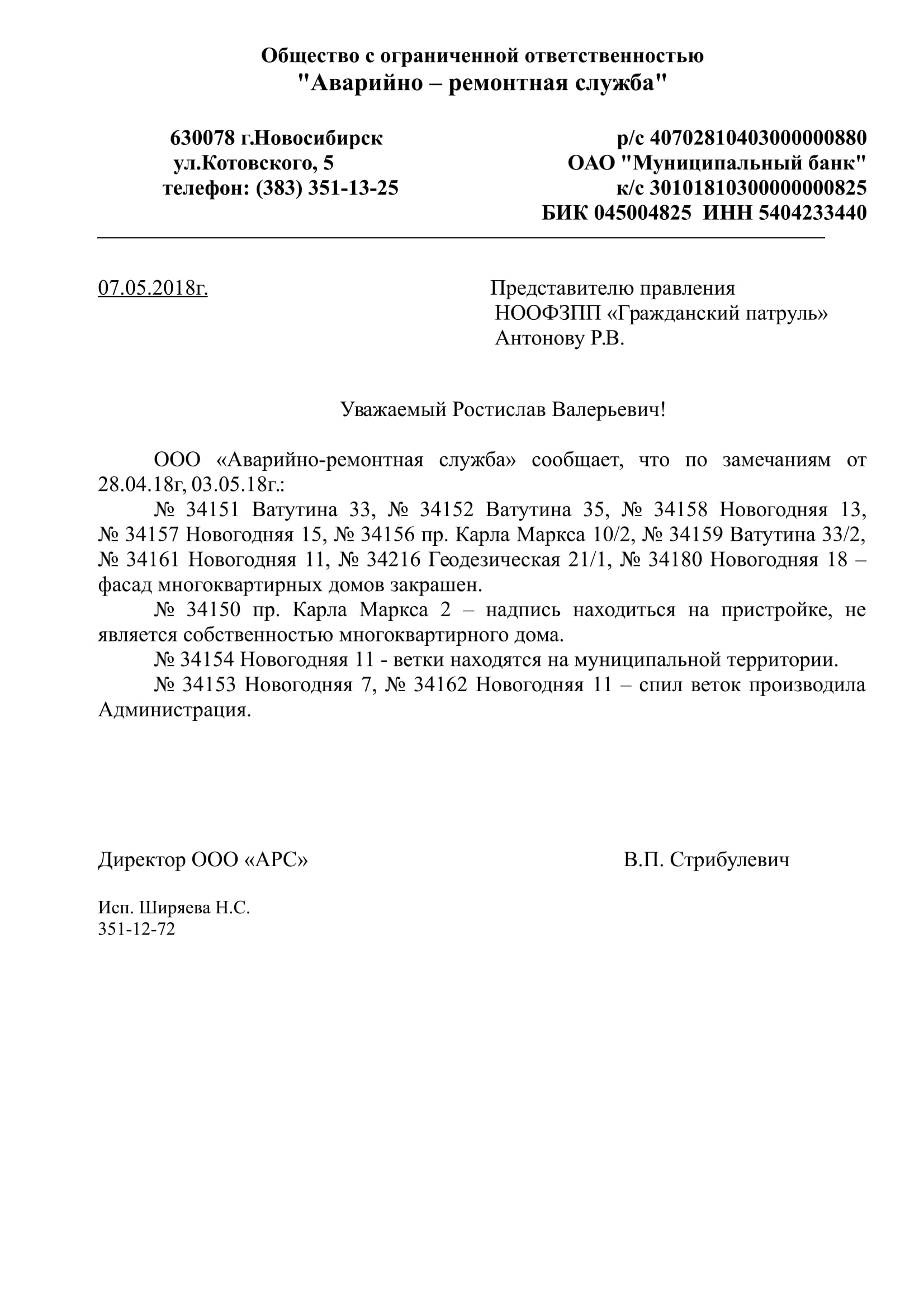 Номер жалобы:34210 Тип жалобы:Иные проблемы ЖКХ Название объекта:Управляющая Компания Регион:Новосибирская область Город:Новосибирск Адрес:ул. Новогодняя, 38 Описание жалобы:Надписи на хозяйственном корпусе Статус: