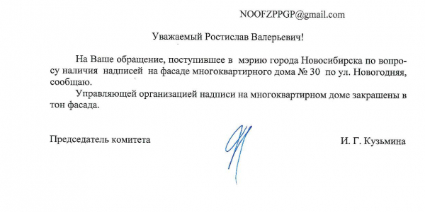 Номер жалобы:34207 Тип жалобы:Иные проблемы ЖКХ Название объекта:Управляющая Компания Регион:Новосибирская область Город:Новосибирск Адрес:ул. Новогодняя, 42/1 Описание жалобы:Надписи на фасаде дома Статус: