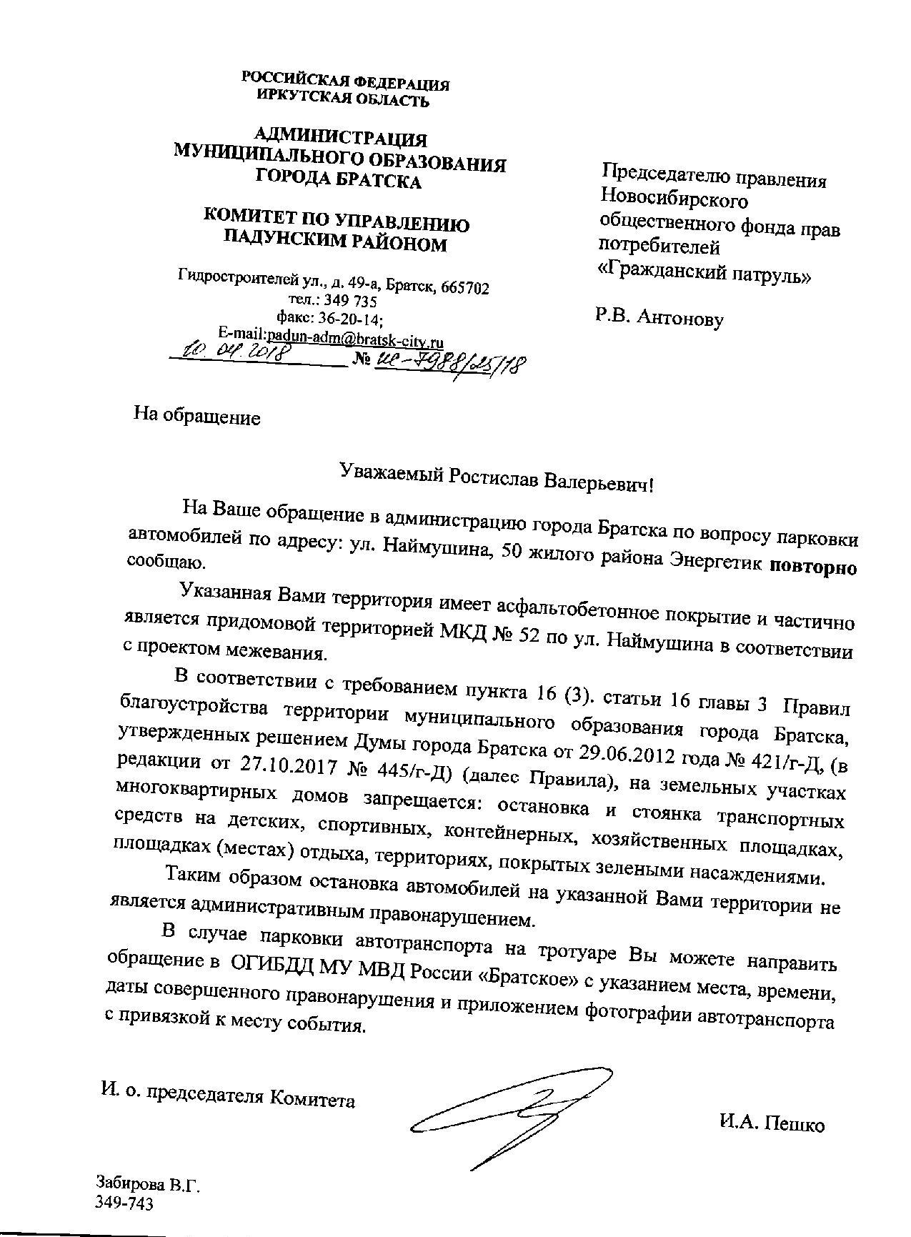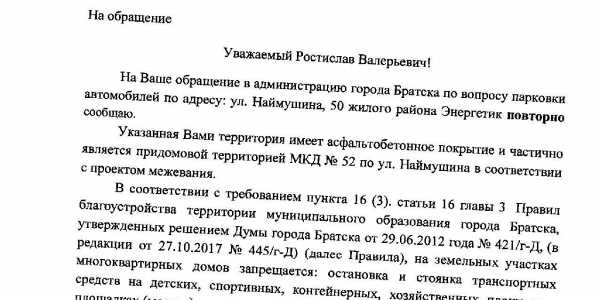 Номер жалобы:32575 Тип жалобы:Иные проблемы ЖКХ Название объекта: Регион:Иркутская область Город:Братск Адрес:Наймушина 52 Описание жалобы:С торца дома прямо под окнами парковка торгового центра Наймушина 50 Статус: