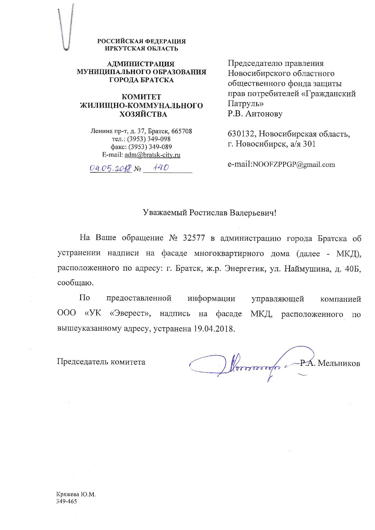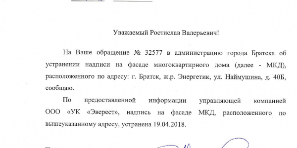 Номер жалобы:32577 Тип жалобы:Иные проблемы ЖКХ Название объекта: Регион:Иркутская область Город:Братск Адрес:Наймушина 40Б Описание жалобы:Надписи на фасаде Статус: