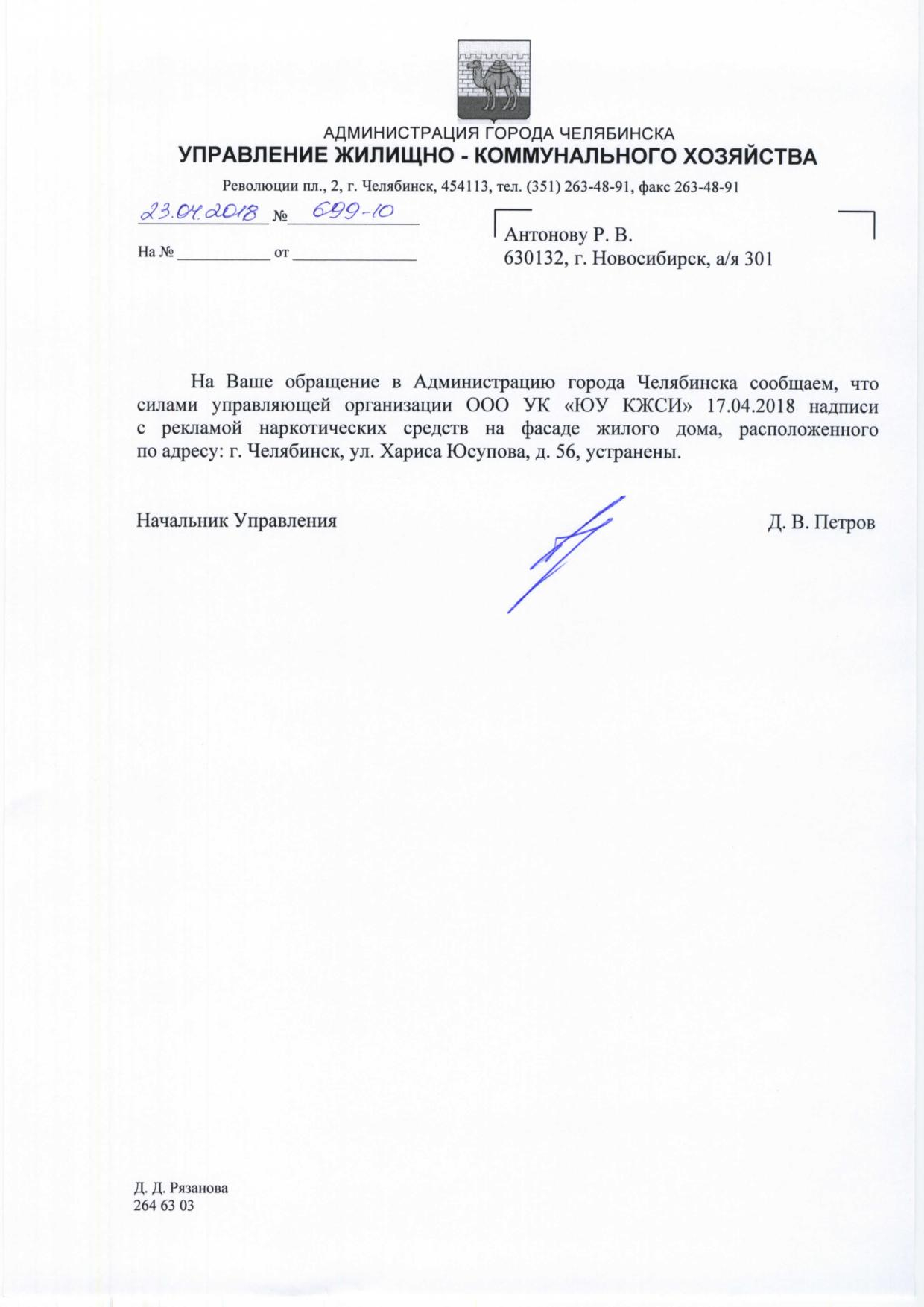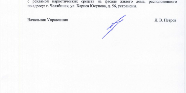 Номер жалобы:32590 Тип жалобы:Иные проблемы ЖКХ Название объекта:Администрация Курчатовского Района Регион:Челябинская область Город:Челябинск Адрес:ул. Хариса Юсупова, 56 Описание жалобы:Надо закрасить граффити с рекламой наркотиков на торце дома Статус: