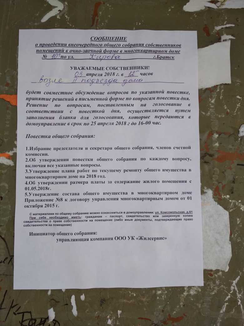 Номер жалобы:32683 Тип жалобы:Иные проблемы ЖКХ Название объекта:ООО УК "Жилсервис" Регион:Иркутская область Город:Братск Адрес:ул. Кирова, 10а Описание жалобы:УК развешала на подъездах объявление о проведении внеочередного собрания собственников 3.04.18 в 12.00. в назначенное время совственники увидели исправление в объявлении на 4.04.18. Исправление внесли ручкой не ранее чем за сутки. Жилищная инспекция отказывается консультировать по телефону о законности подобного факта. А на повестке дня между прочим вопрос увеличения платы. Статус: