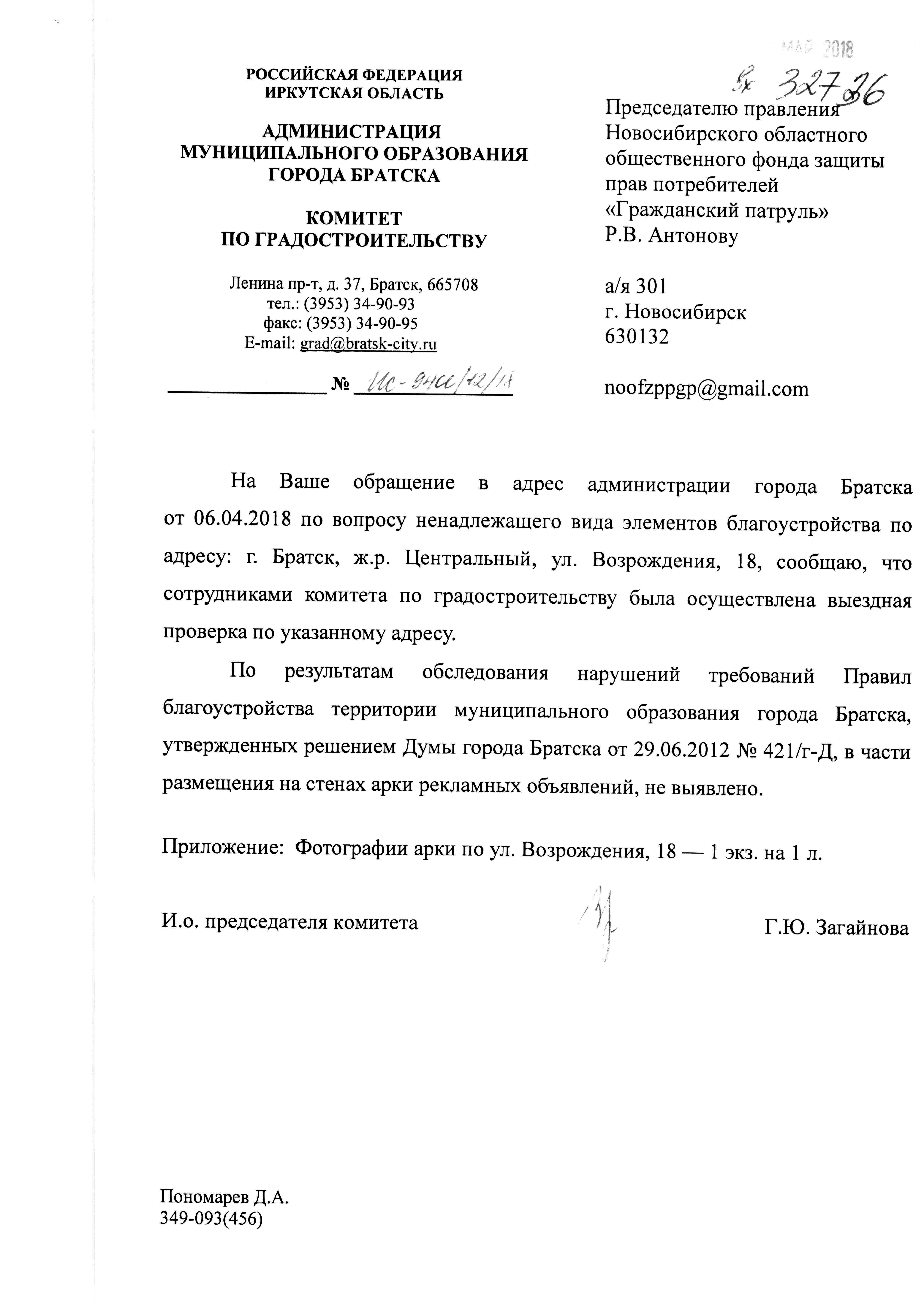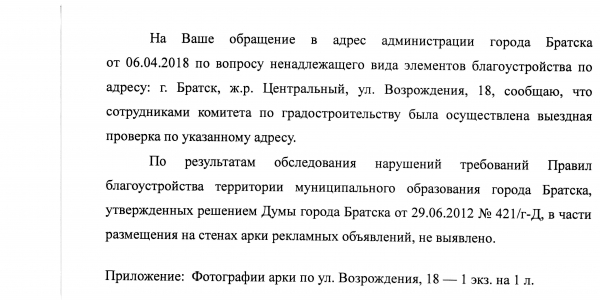 Номер жалобы:32736 Тип жалобы:Иные проблемы ЖКХ Название объекта:А Регион:Иркутская область Город:Братск Адрес:ул. Возрождения, 18 Описание жалобы:Загрязнения стен арки рекламой Статус: