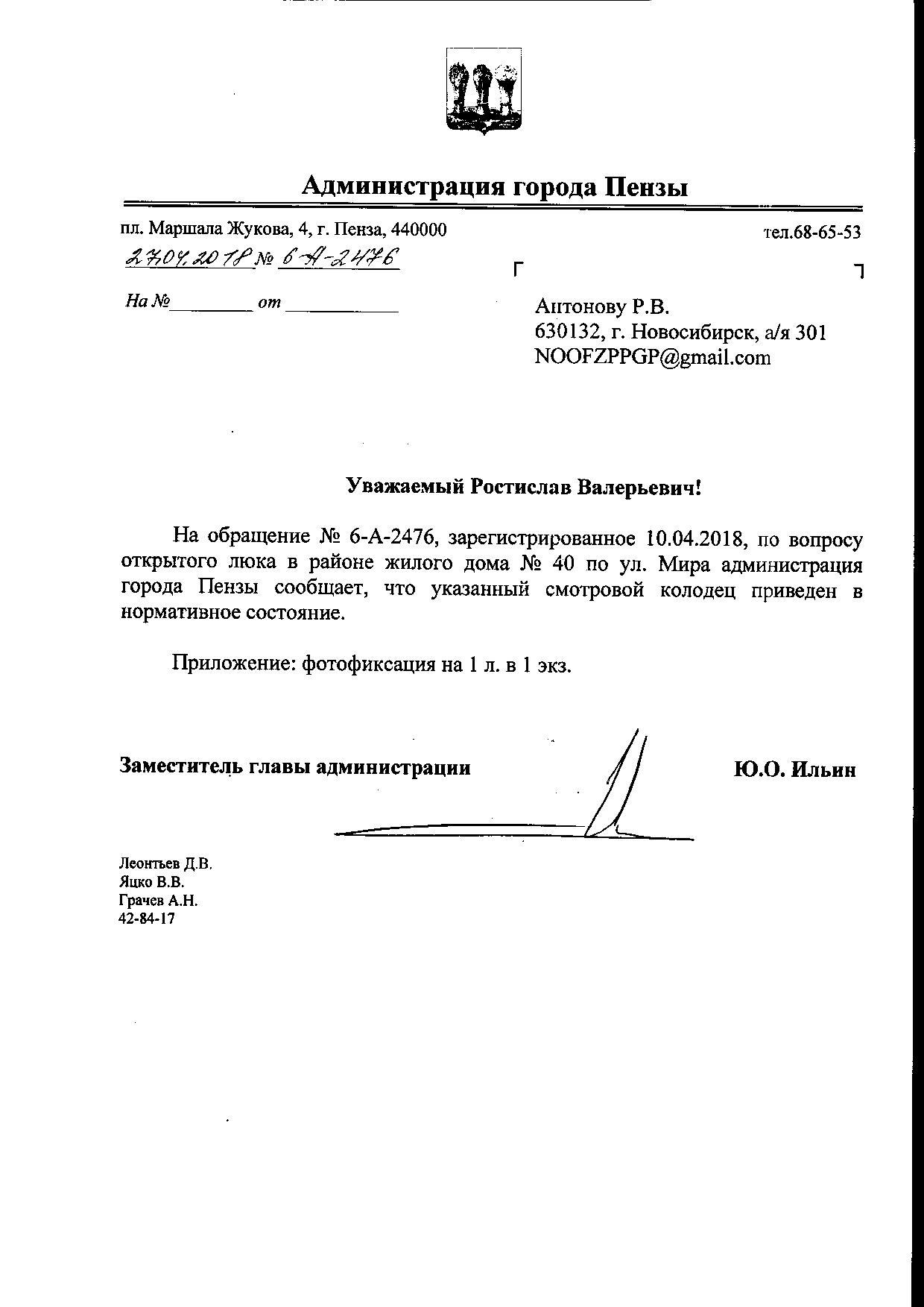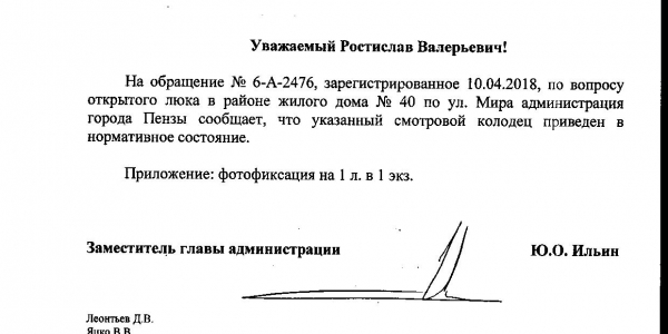 Номер жалобы:32750 Тип жалобы:Иные проблемы ЖКХ Название объекта:Жк Фаворит Регион:Пензенская область Город:Пенза Адрес:ул. Мира, 40 Описание жалобы:Открытый люк Статус: