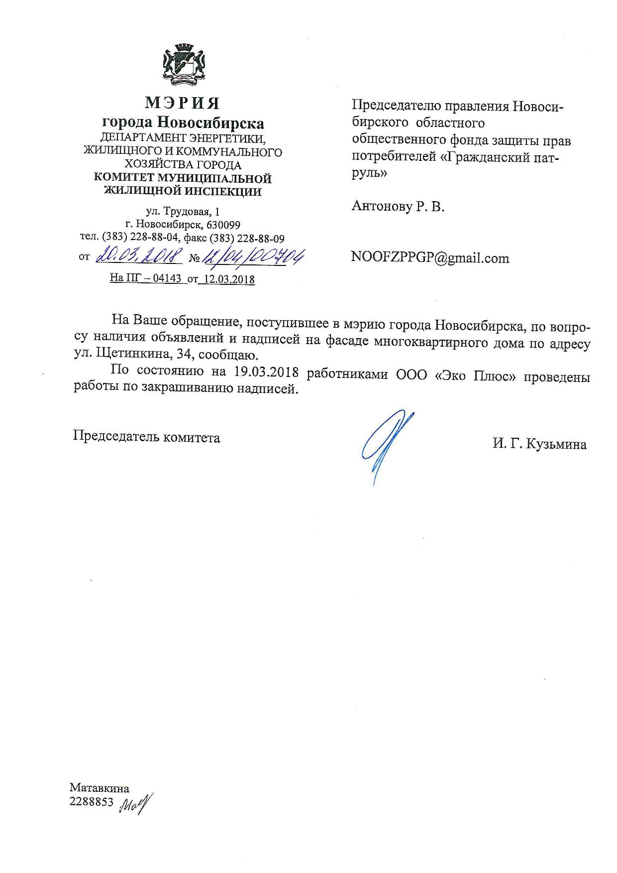 Номер жалобы:31263 Тип жалобы:Иные проблемы ЖКХ Название объекта:Управляющая Компания Регион:Новосибирская область Город:Новосибирск Адрес:ул. Щетинкина, 34 Описание жалобы:Надписи на фасаде Статус:
