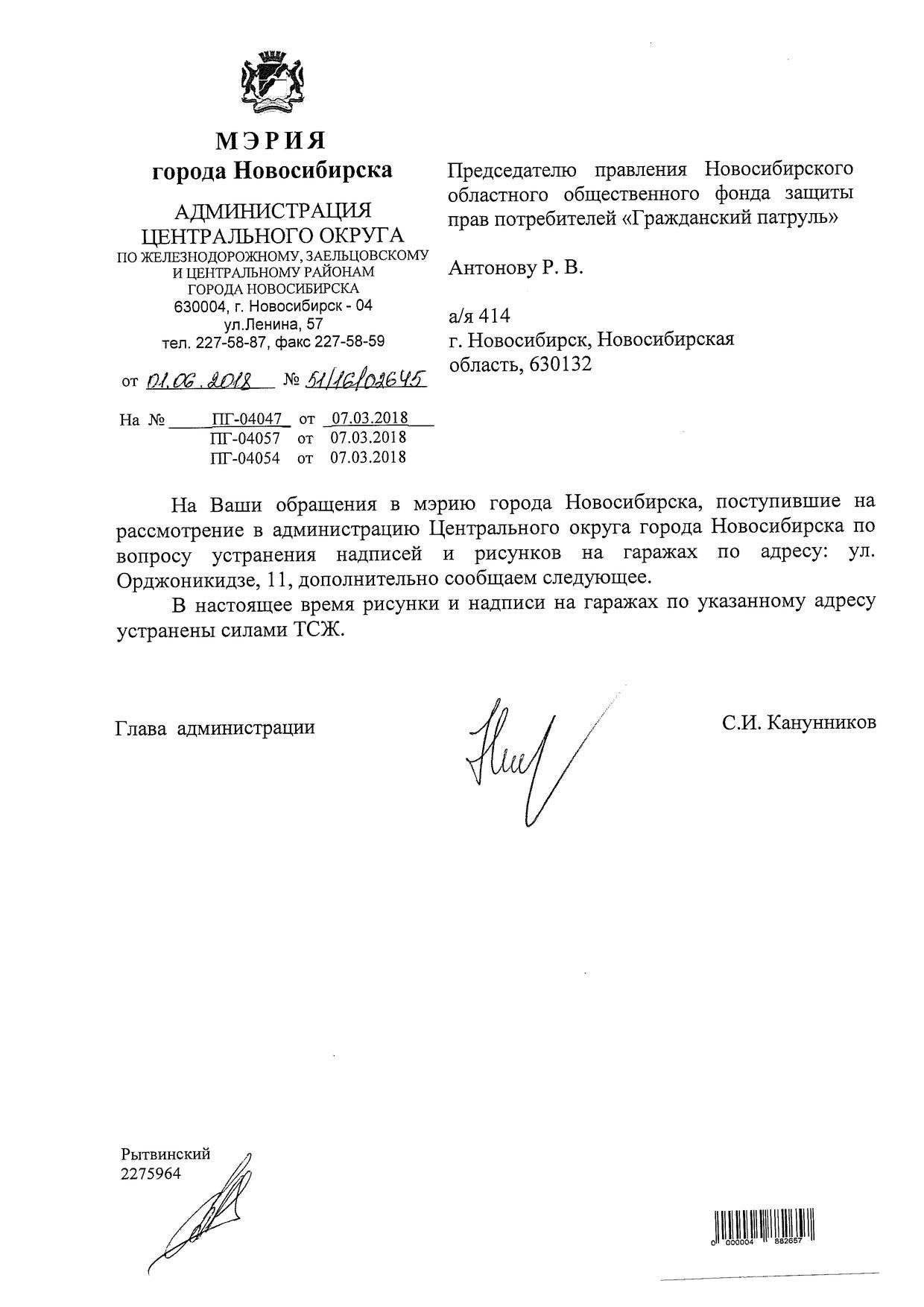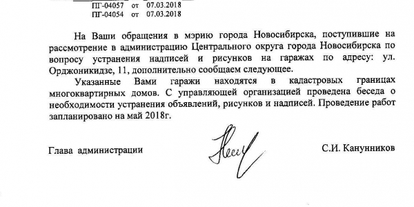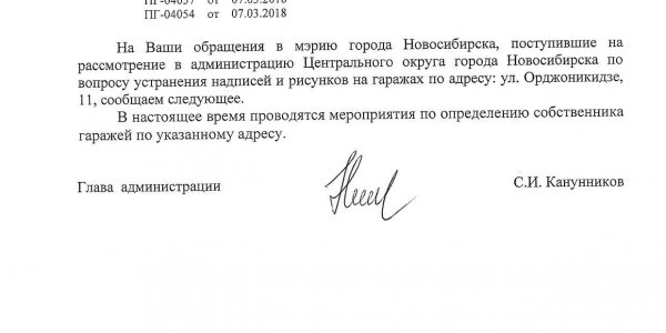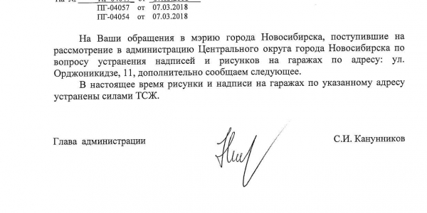 Номер жалобы:31209 Тип жалобы:Иные проблемы ЖКХ Название объекта:Управляющая Компания Регион:Новосибирская область Город:Новосибирск Адрес:ул. Орджоникидзе, 11 Описание жалобы:Надписи на гараже Статус: