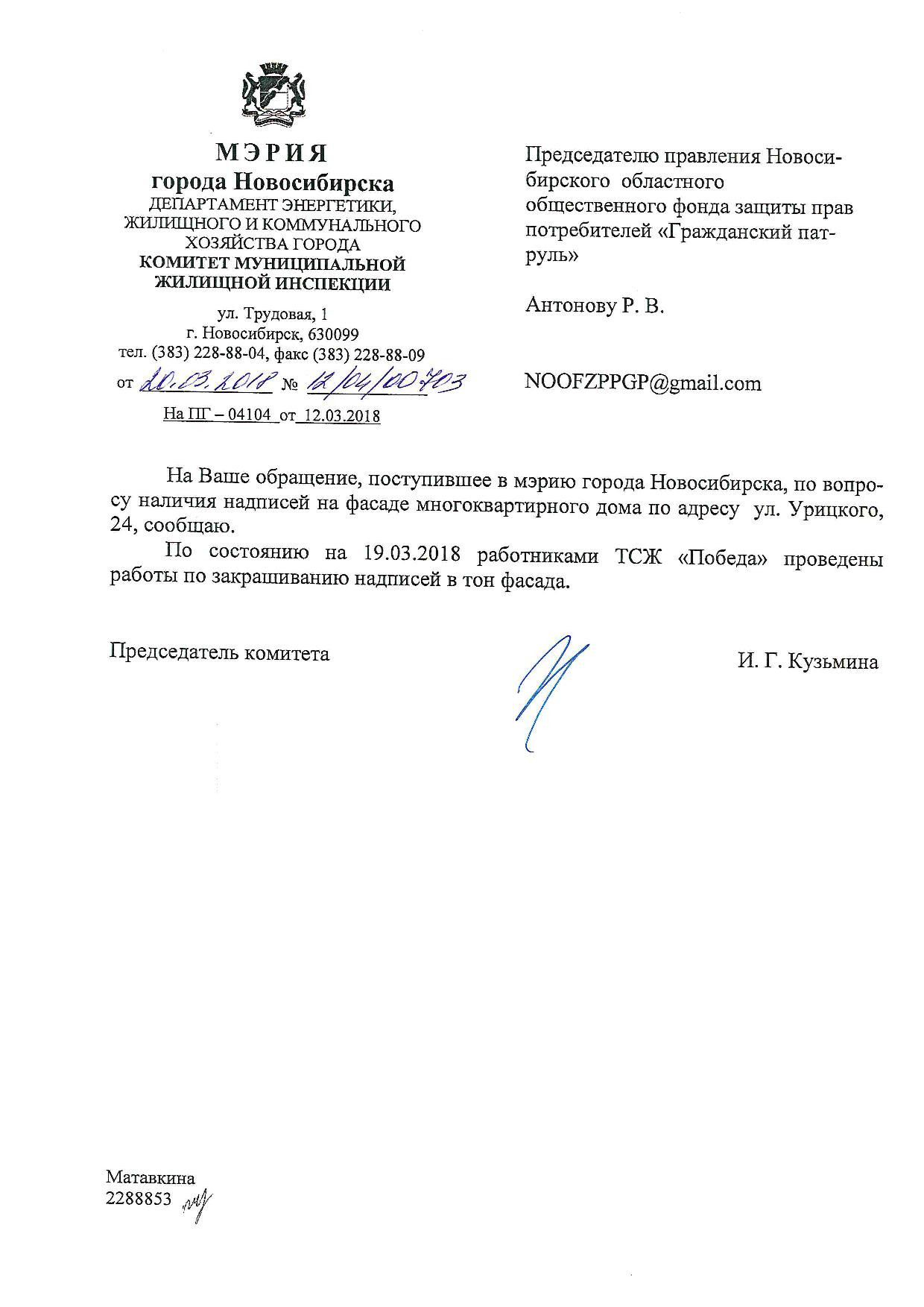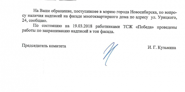 Номер жалобы:31220 Тип жалобы:Иные проблемы ЖКХ Название объекта:Управляющая Компания Регион:Новосибирская область Город:Новосибирск Адрес:ул. Урицкого, 24 Описание жалобы:Надпись на фасаде дома Статус: