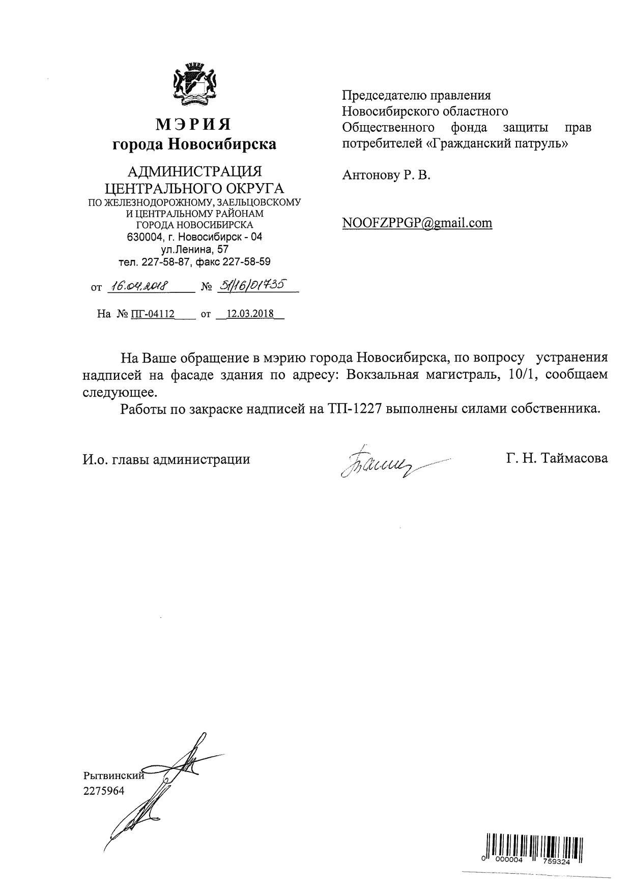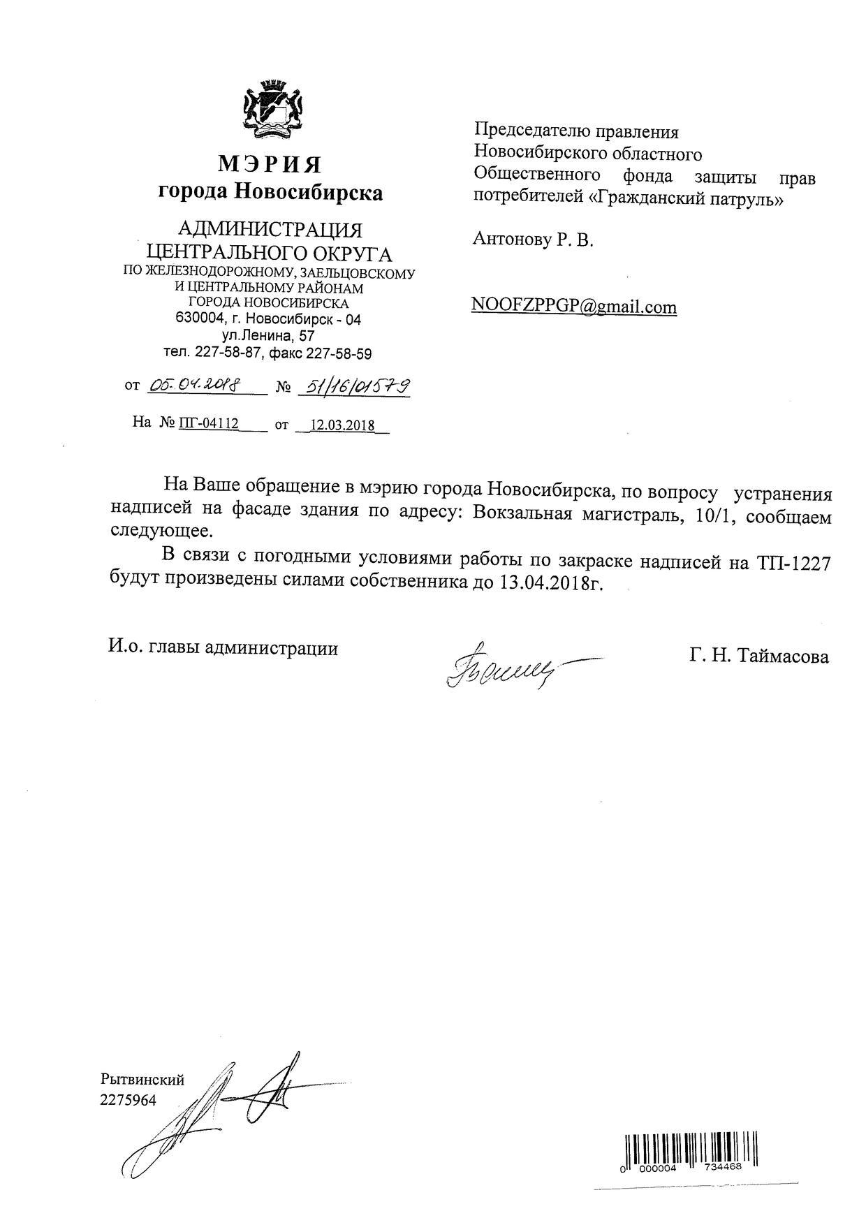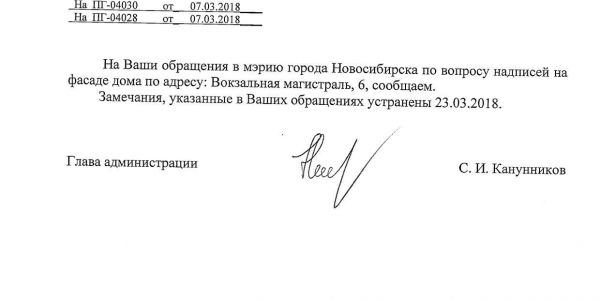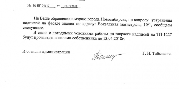 Номер жалобы:31168 Тип жалобы:Иные проблемы ЖКХ Название объекта:Управляющая Компания Регион:Новосибирская область Город:Новосибирск Адрес:ул. Вокзальная Магистраль, 6А Описание жалобы:Надписи закрашены не в тон Статус: