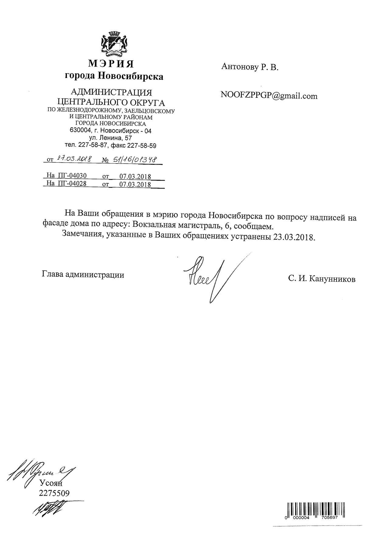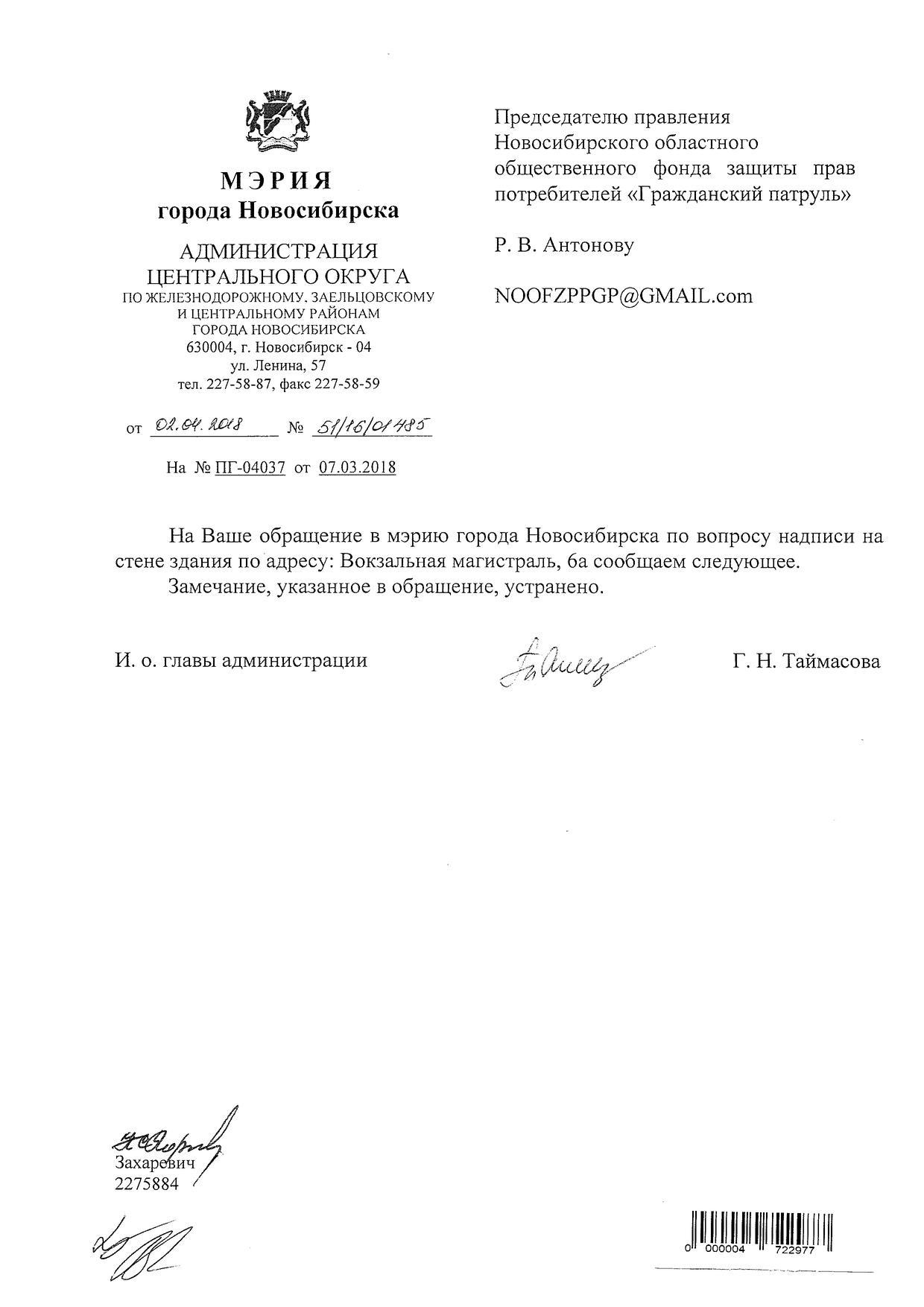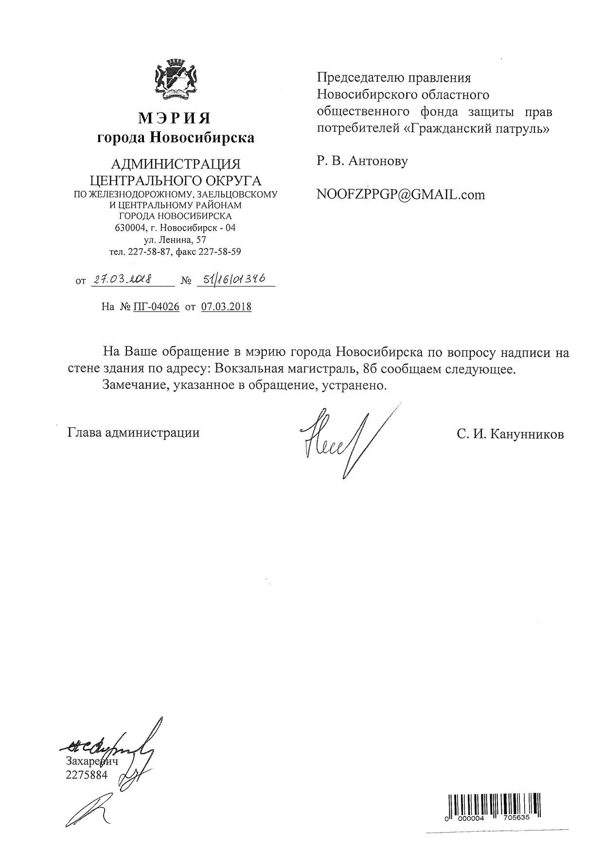 Номер жалобы:31168 Тип жалобы:Иные проблемы ЖКХ Название объекта:Управляющая Компания Регион:Новосибирская область Город:Новосибирск Адрес:ул. Вокзальная Магистраль, 6А Описание жалобы:Надписи закрашены не в тон Статус: