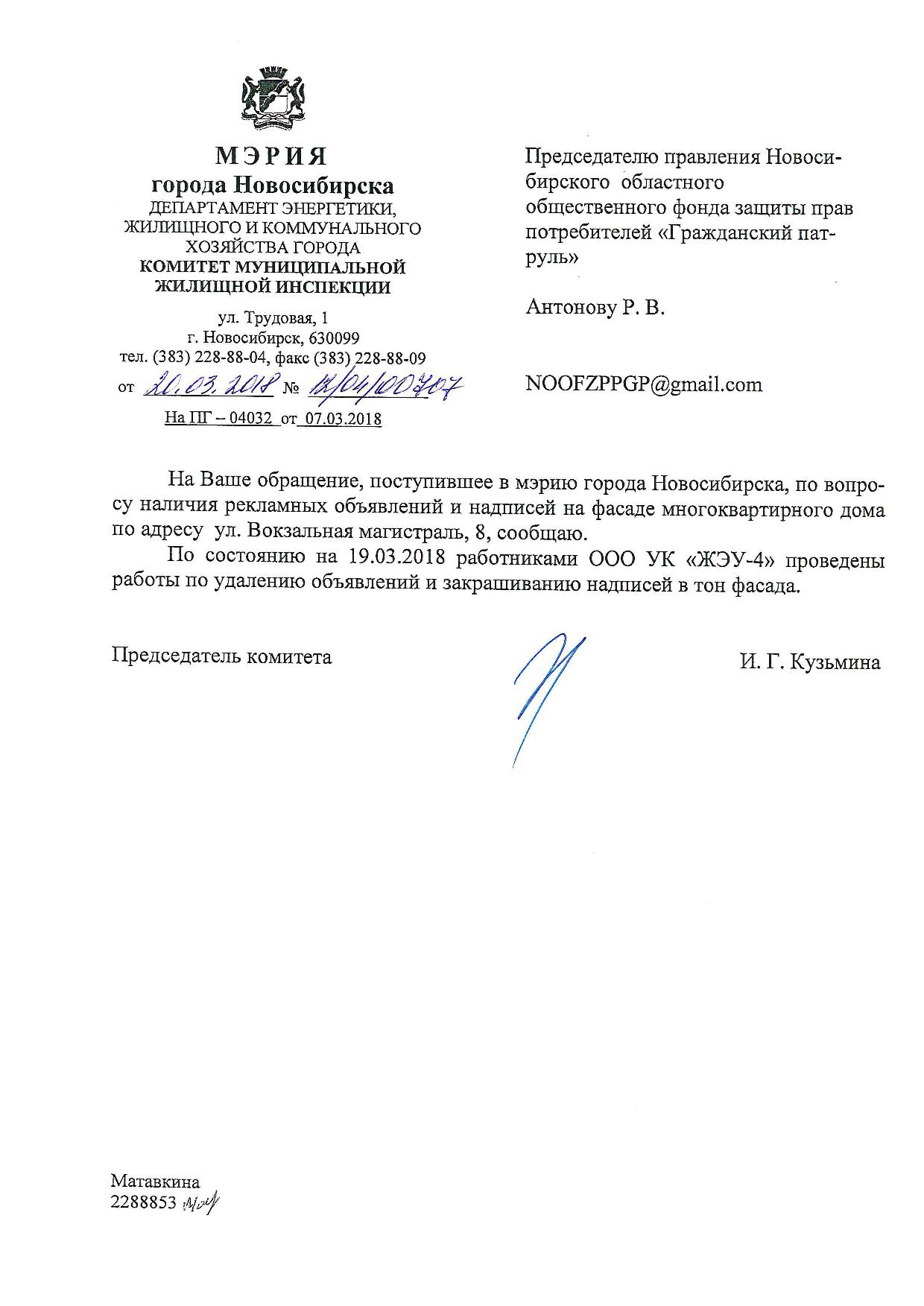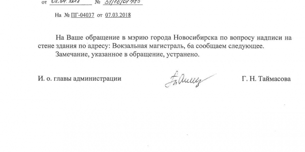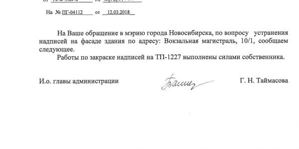Номер жалобы:31170 Тип жалобы:Иные проблемы ЖКХ Название объекта:Управляющая Компания Регион:Новосибирская область Город:Новосибирск Адрес:ул. Вокзальная Магистраль, 6 Описание жалобы:Надписи на фасаде Статус: