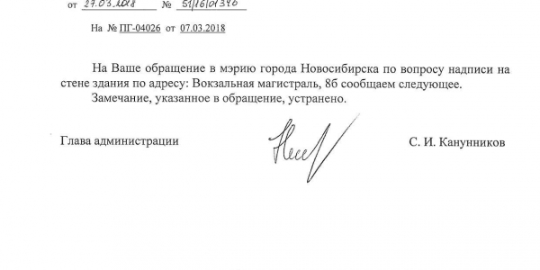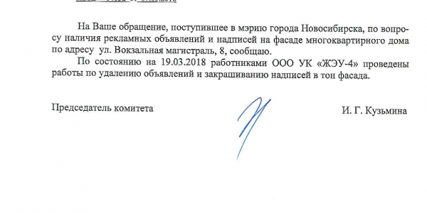 Номер жалобы:31176 Тип жалобы:Иные проблемы ЖКХ Название объекта:Управляющая Компания Регион:Новосибирская область Город:Новосибирск Адрес:ул. Вокзальная Магистраль, 10/1 Описание жалобы:Надписи Статус: