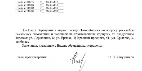 Номер жалобы:30986 Тип жалобы:Иные проблемы ЖКХ Название объекта:Управляющая Компания Регион:Новосибирская область Город:Новосибирск Адрес:ул. Достоевского, 12 Описание жалобы:Красный проспект 71, объявления на фасаде Статус: