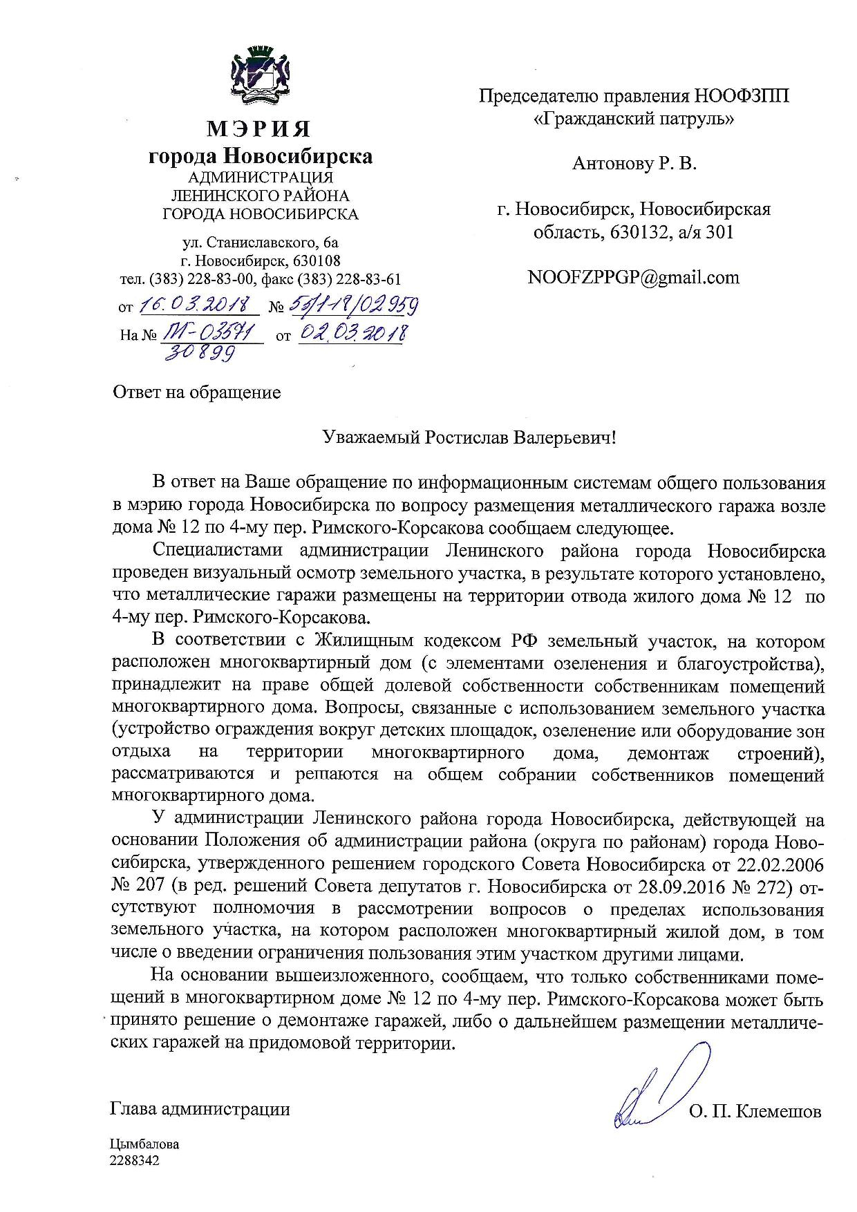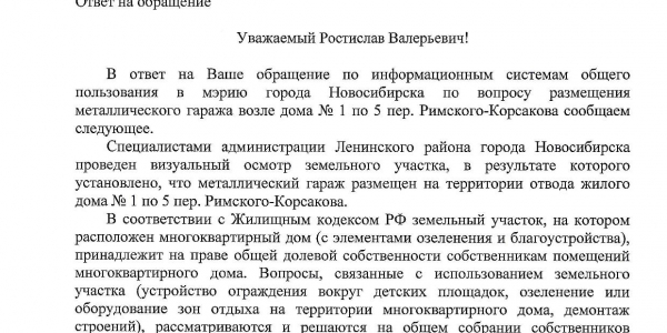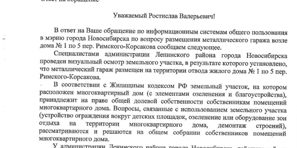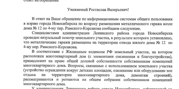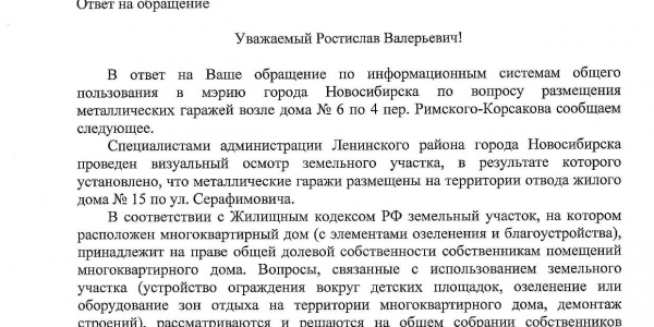 Номер жалобы:30899 Тип жалобы:Иные проблемы ЖКХ Название объекта:Управляющая Компания Город:Новосибирск Адрес:Новосибирск, 4-й Римского-Корсакова переулок, 12 Описание жалобы:Гаражи Статус: