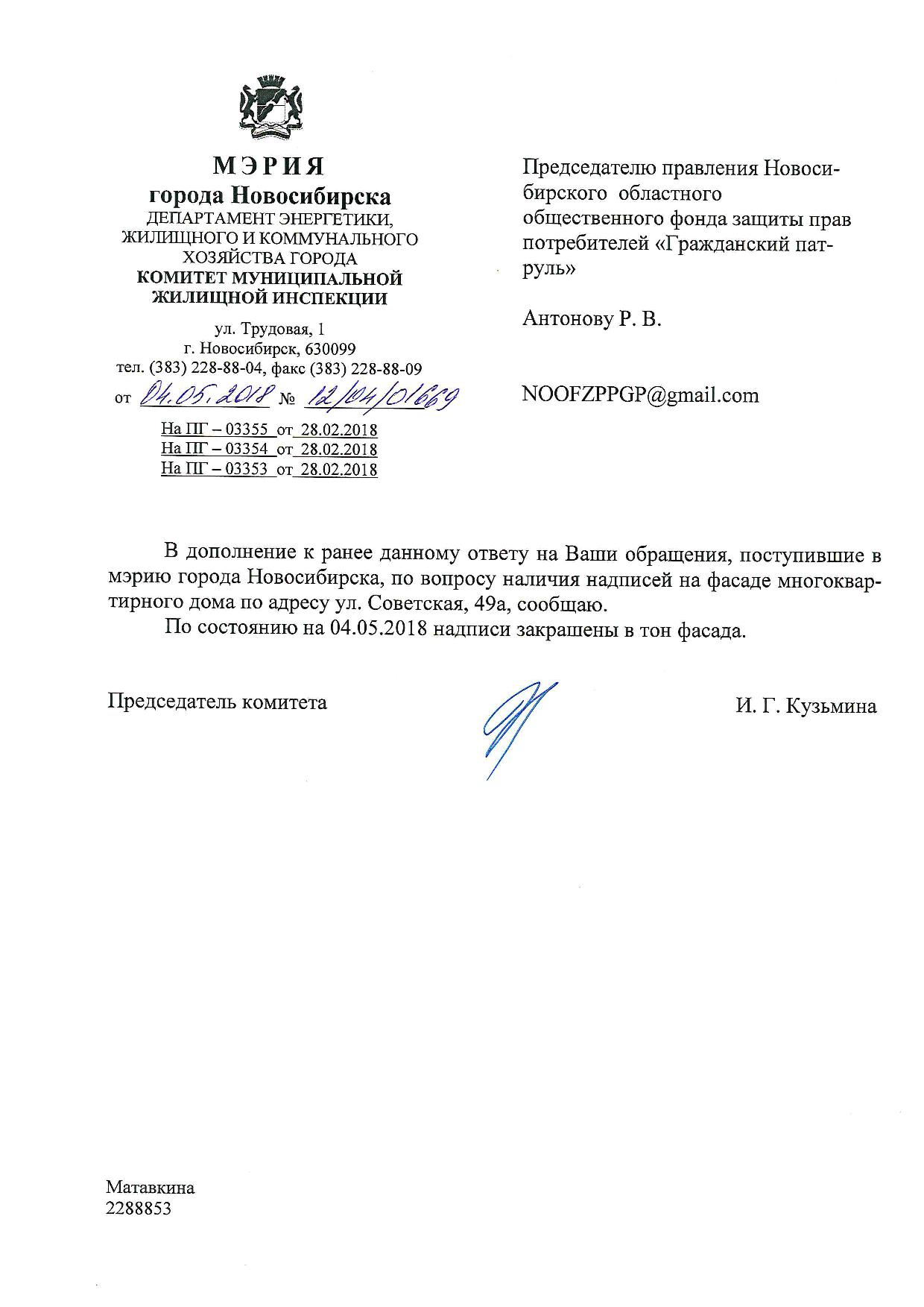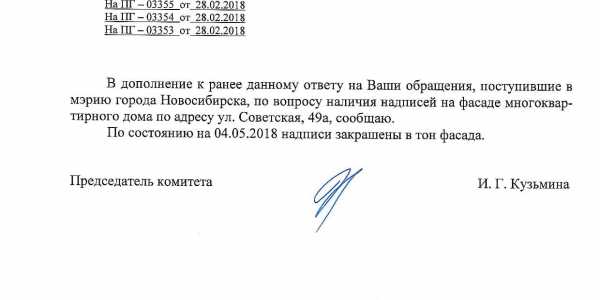 Номер жалобы:30738 Тип жалобы:Иные проблемы ЖКХ Название объекта:Управляющая Компания Регион:Новосибирская область Город:Новосибирск Адрес:ул. Советская, 49А Описание жалобы:Надписи закрашены не в тон Статус: