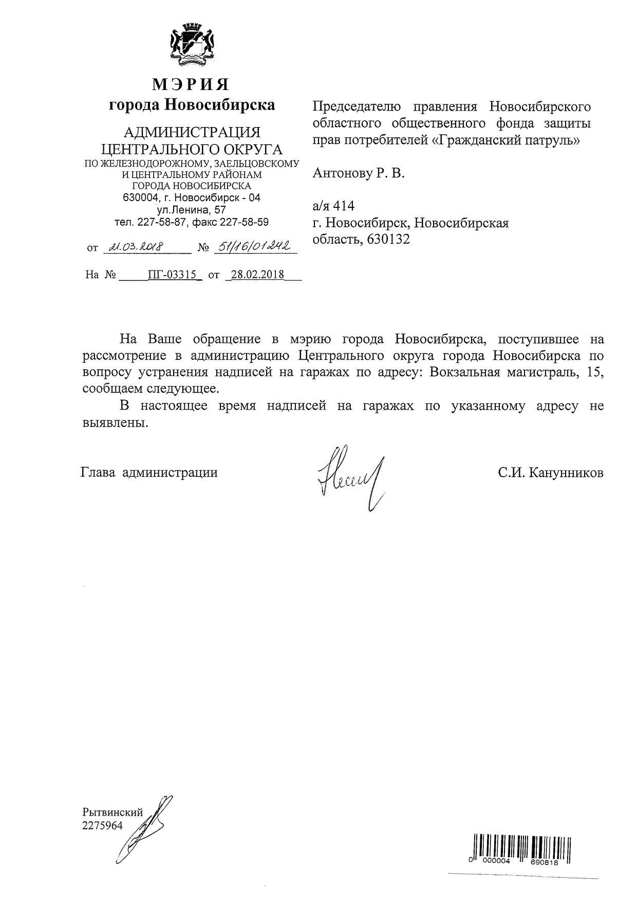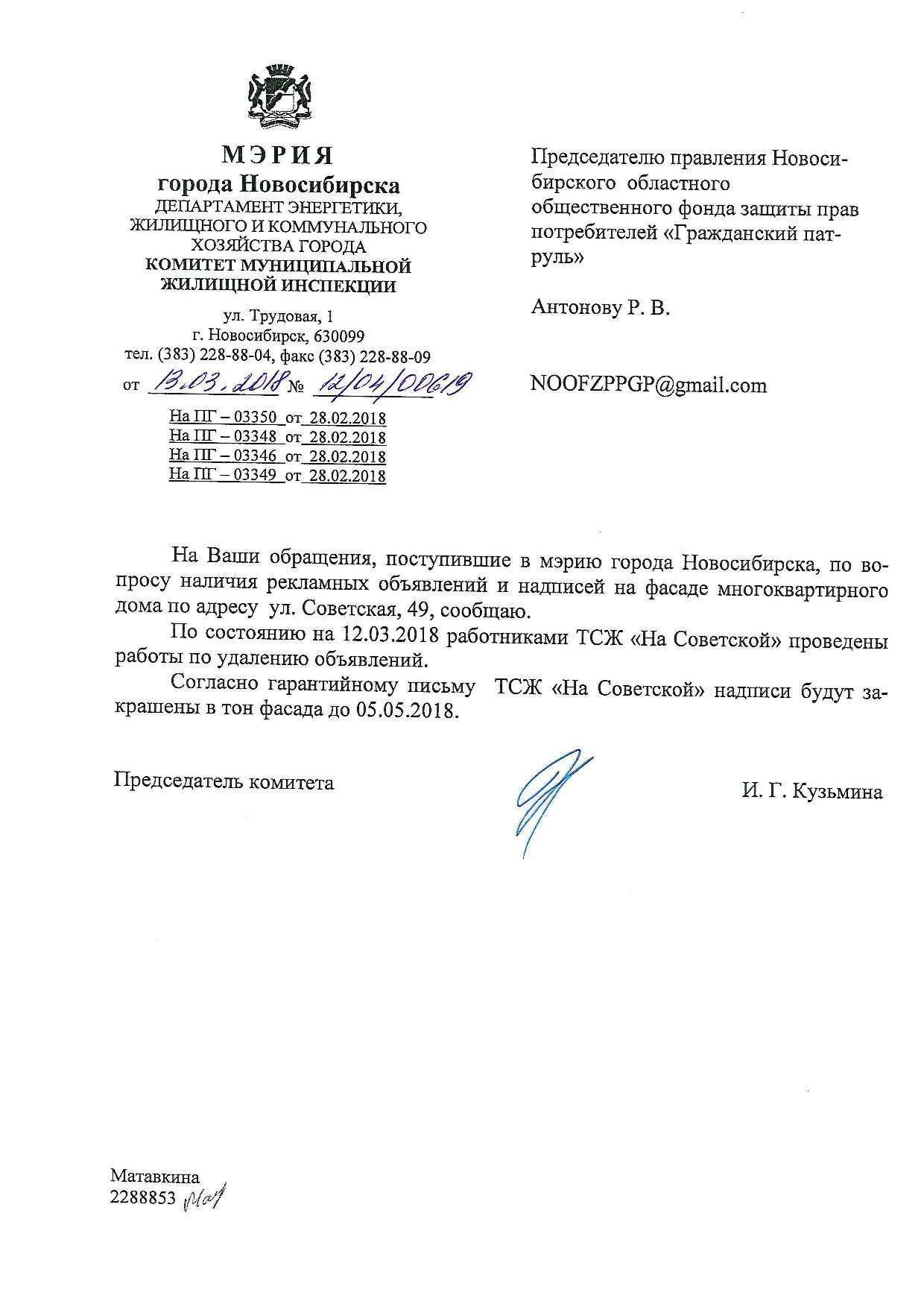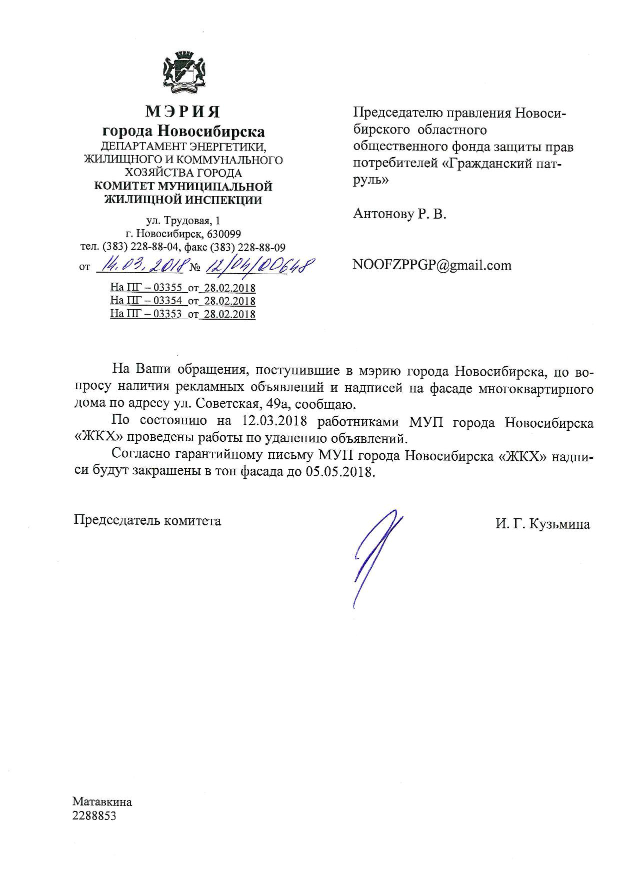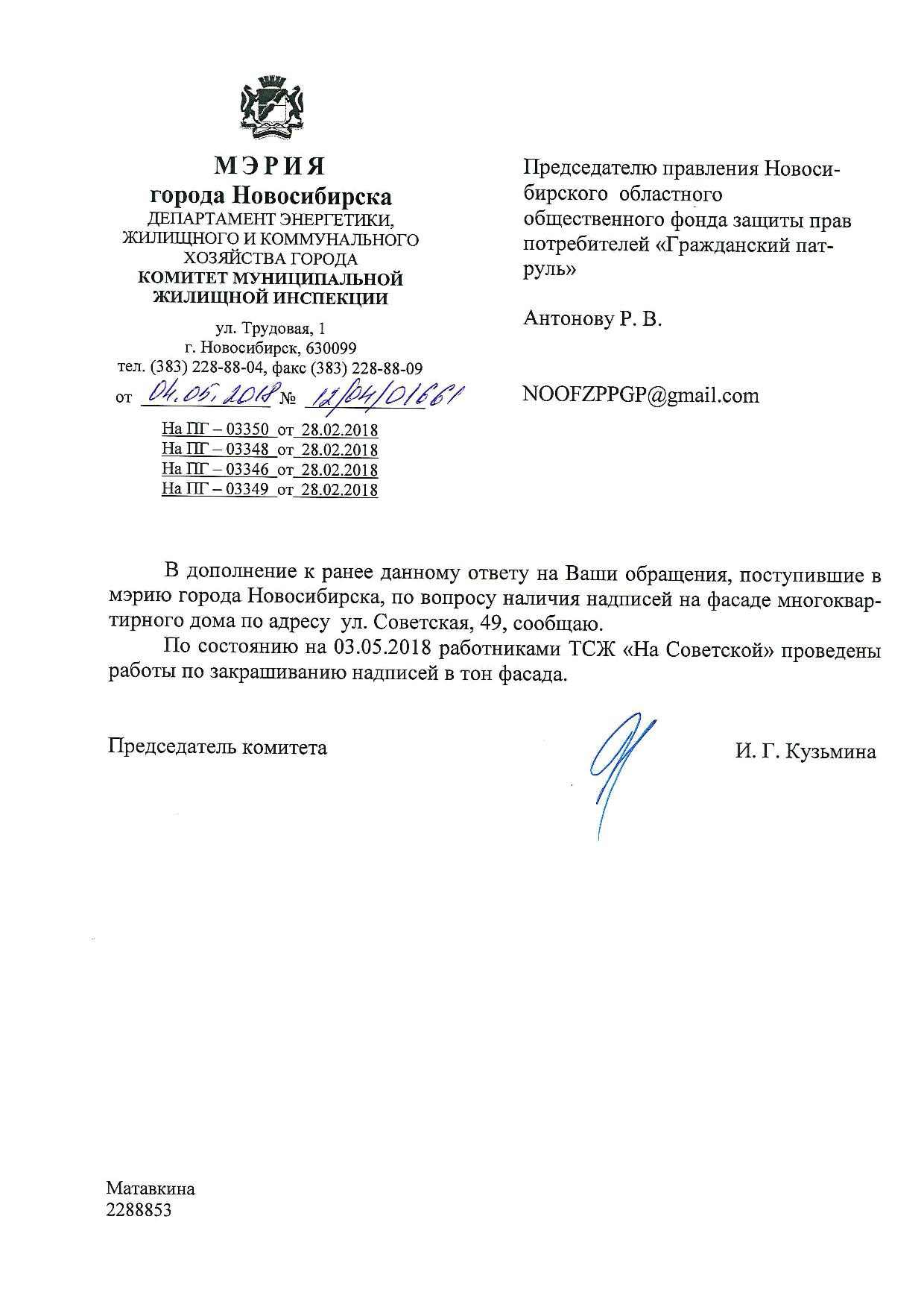 Номер жалобы:30739 Тип жалобы:Иные проблемы ЖКХ Название объекта:Управляющая Компания Регион:Новосибирская область Город:Новосибирск Адрес:ул. Советская, 49А Описание жалобы:Плохо закрашенные надписи Статус: