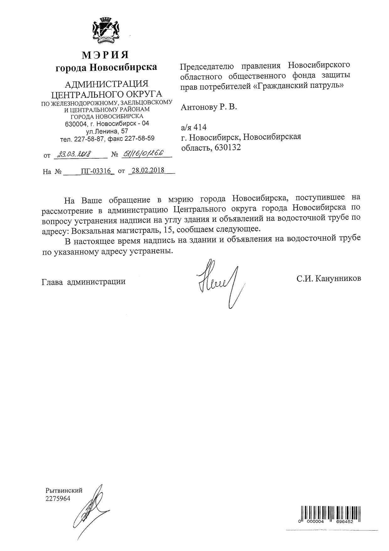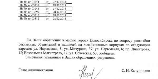 Номер жалобы:30740 Тип жалобы:Иные проблемы ЖКХ Название объекта:Управляющая Компания Регион:Новосибирская область Город:Новосибирск Адрес:ул. Советская, 53 Описание жалобы:объявления на хозяйственном корпусе Статус: